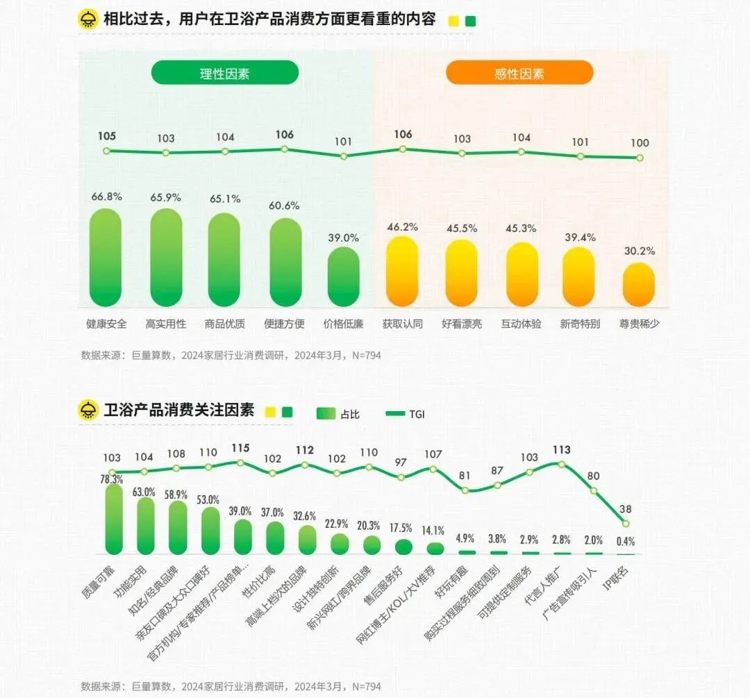 在提升品质生活的家居品类中,卫浴产品表现出较强的理性感性融合趋势。用户理性上更关注“健康安全”、“便捷方便”,情感上更重视“获取认同”,如购买关注“高端上档次的品牌”。智能卫浴产品刚好契合了用户对健康、便捷、高级感的需求。