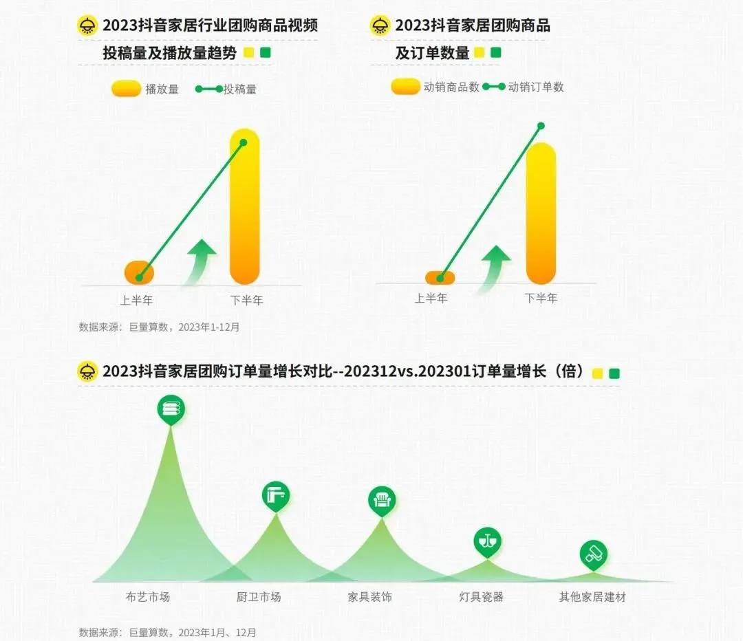 抖音平台家居行业本地生活营销迎来新爆发周期。数据显示,2023年下半年开始,抖音平台团购商品视频投稿量、播放量、动销商品量、动销订单数均呈现爆发式增长趋势。细分行业看,布艺市场、厨卫市场、家具装饰、灯具瓷器类团购订单增长迅猛。