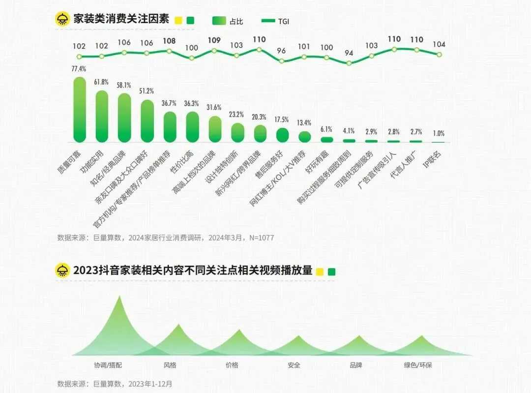 家装消费方面,质量可靠、功能实用周然重要,但明显可以看出,用户对家装高端上档次品牌、设计独特创新、新兴网红/跨界品牌等的格外关注。家装往往涉及个人生活空间的打造,而人们对家居环境的舒适度。温馨感和美感往往带有强烈的个人情感需求,因此在选购家装产品时,更易受到情感和审美的驱动。