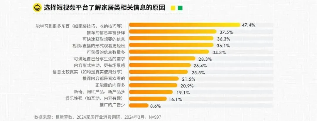 调研显示,消费者更多通过线上渠道获取家居相关信息,短视频平台与电商APP成为获取加居信息的两大核心渠道,尤其是短视频,其因内容知识性更受用户青睐,可让用户在轻松娱乐的氛围下,快速学习包括家装技巧、收纳技巧等家居知识。另外,推荐信息丰富多样、可快速获取想要信息也是消费者选择短视频的重要原因,可见在信息爆炸的今天,能够迅速准确地获取所需信息对于用户家居选购消费显得尤为重要。
