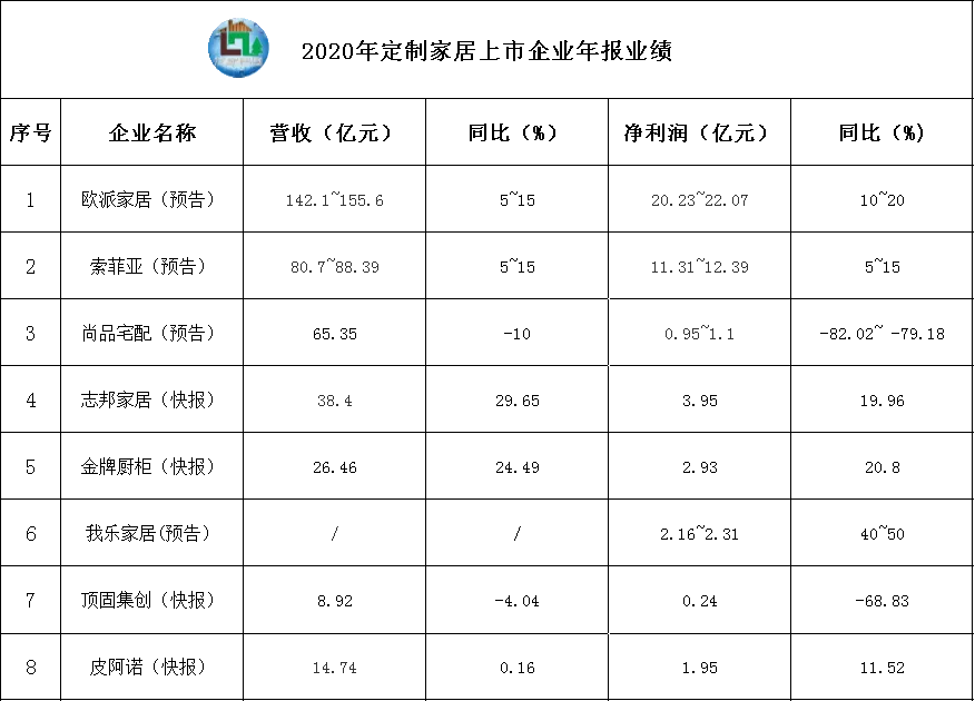 日前,九大全屋定制上市公司中除好莱客外,欧派家居、索菲亚、尚品宅配、志邦家居、金牌厨柜、我乐家居、顶固集创、皮阿诺已相继发布了2020年业绩预告或快报。从整体的大数据来看,即使在疫情的冲击下,依然有大部分企业保持了营收和净利润的不同程度增长;其中,志邦家居的营收涨幅最高,接近30%;我乐家居净利润最高,涨幅达到了40%-50%。