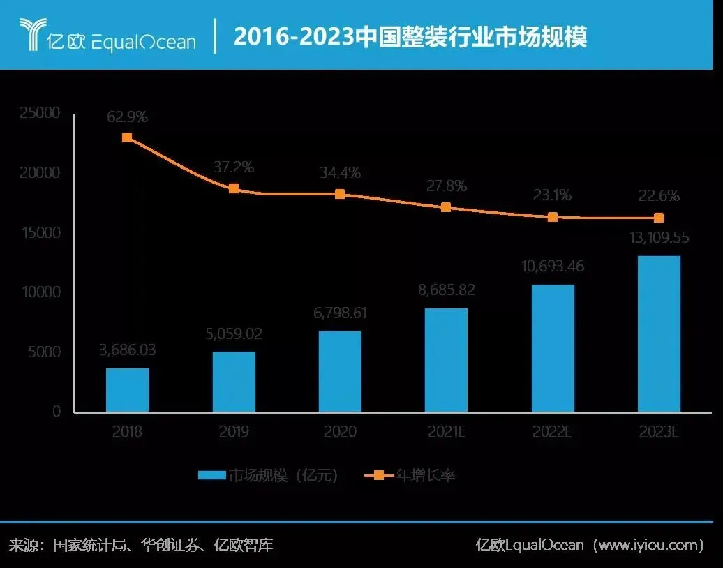 2、 巨大市场份额的刺激。亿欧智库《2020-2021家居行业年度盘点与趋势洞察》报告显示,预计2021年整装行业的市场规模将达到8685.82亿元,并将继续保持20%以上的年增长速度发展。