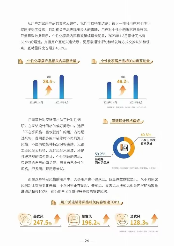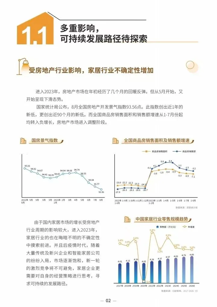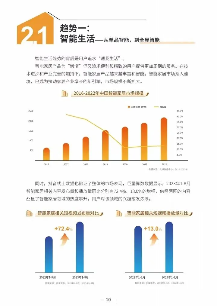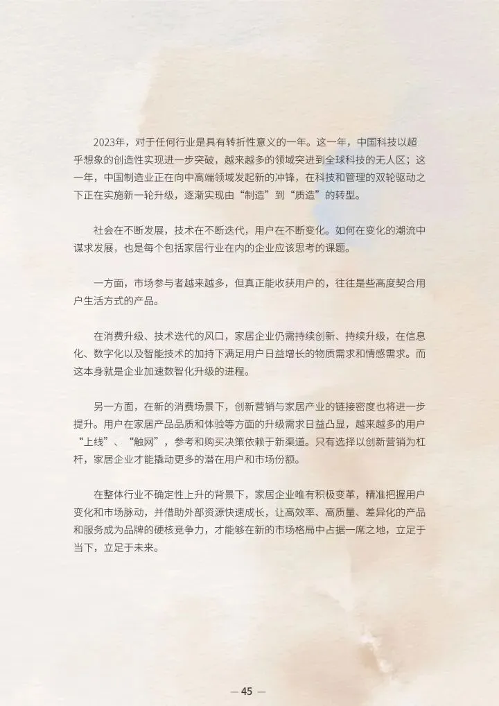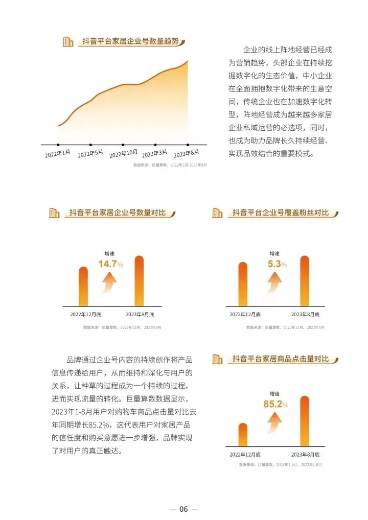 2023 年,受房地产行业和用户理性消费等因素影响,中国家居市场不确定性逐渐凸显。而线上用户对家居行业的热情和消费潜力依旧存在,繁荣的生态也在酝酿着新一轮的消费浪潮。在该浪潮下,家居企业品牌也借助抖音等新媒体平台构筑起线上生态的全场景生意场,实现企业的长效经营和品牌价值的持续传递。