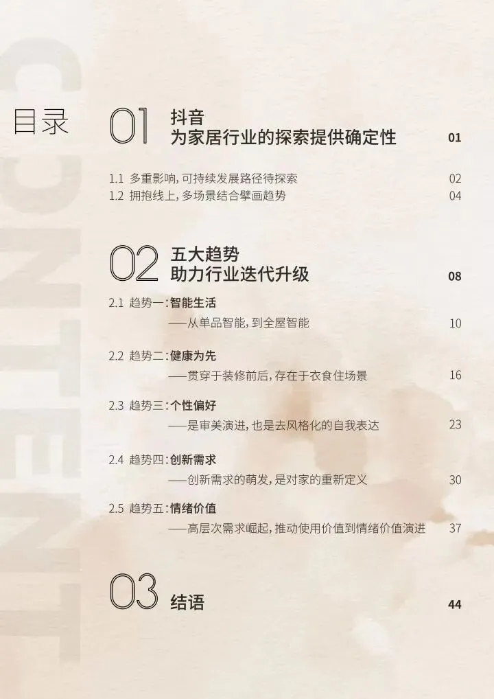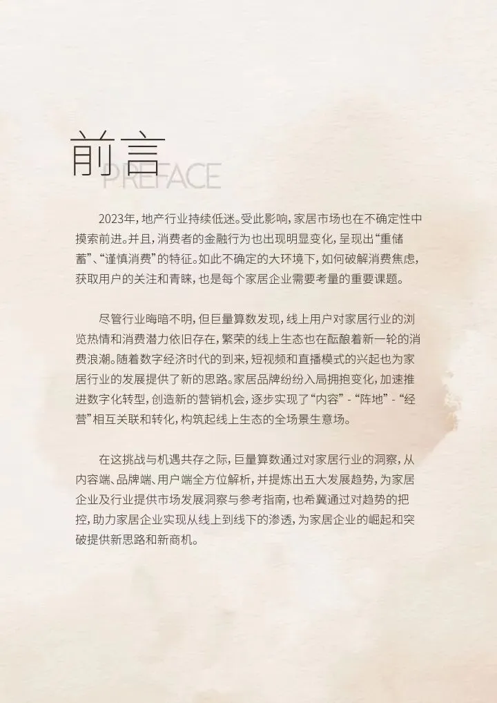 针对家居行业格局和用户需求变化,巨量算数发布《2023中国家居行业趋势洞察报告》(点击文末“阅读原文”查看完整报告),将家居行业的发展特征提炼为五大趋势,旨在盘点行业生态和用户需求,理清行业脉络和未来趋势,为企业创造洞察市场的新视角和新商机。