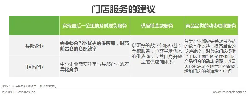 门店服务方面,主要从快消B2B企业在实现最后一公里的及时送货服务,帮助门店实现商品品类的最优动态选取组合,为门店提供多样化服务提出运营建议。对于具有电商巨头背景的头部企业,需要整合当地优秀的供应商,提高前置仓的仓配效率,是解决送货及时的重要一环,这是其建立中心化供应链的重要补充。对于其他企业,尤其是中小企业,在最后一公里的及时送货服务方面,则应需要注重与头部企业的差异化竞争;同时以更好的数字化服务甚至金融服务,争夺当地优秀的供应商,完善自身开放型的供应链体系。其中,金融服务包括提高供应链的资金结算能力,减少门店的资金压力。
