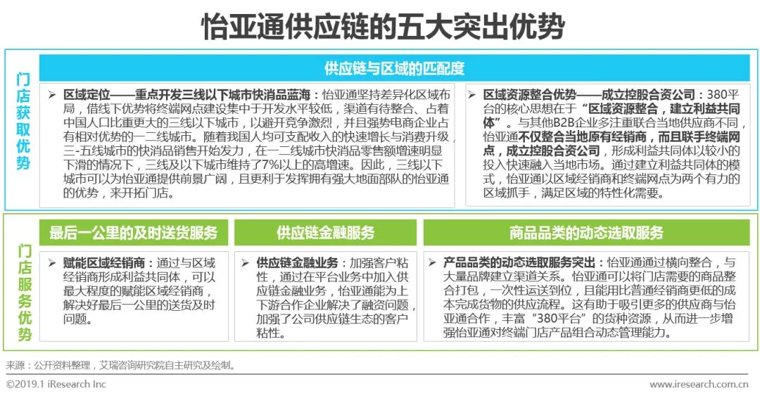 已经在一、二线城市占据先发优势的快消B2B企业,多选择以一、二线城市为根据地,并不断向三线以下城市及农村区域不断渗透的发展模式,如京东新通路与阿里零售通。为了避免与在一、二线城市具有先发优势的企业直接冲突,一些企业根据自身的供应链资源,采取渠道下沉的战略,进行差异化布局。当前有以三线以下城市为主要业务区域的企业,如怡亚通充分发挥自己强大的供应链物流优势,将服务下沉到三线及以下城市甚至农村;有以农村市场为主要布局区域的企业,如邮乐充分调动中国邮政自有的全国仓储物流体系及邮政地推人员,在农村区域进行拓展。快消B2B企业只要能根据自身禀赋,选对道路,就有望在中国快消B2B市场的盛宴中占到一席之地。