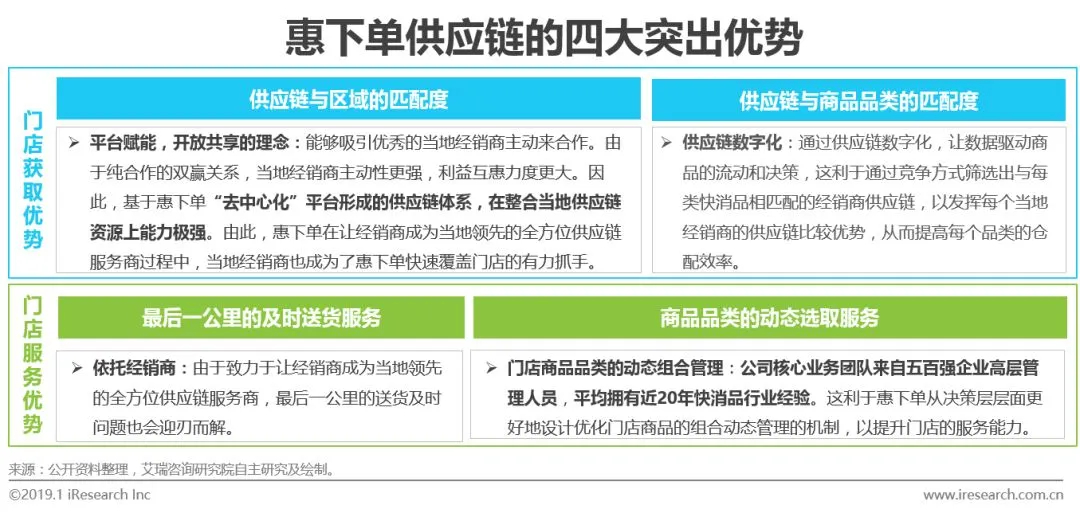 惠下单是“去中心化”平台,在完全开放的供应链模式基础上构建而成。秉承“四不一坚持”,即坚持“不自营,不自建物流,不扰乱市场价格,不破坏分销体系”,着力在赋能给经销商,让经销商成为当地领先的全方位供应链服务商,从而贡献更多价值给品牌商和更好服务零售商。惠下单的供应链突出优势是模式轻,效率高,更利于吸引优秀的当地经销商主动来合作。在传统快消通路在快消市场依然起着主导作用的行情下,惠下单更利于抢占先机。惠下单另一个重要竞争优势是获得腾讯的战略投资。二者的战略合作,为零售B2B提出了新的发展方向,即不进入各个环节进行颠覆和取代,只用大数据赋能品牌商经销商及门店,做好管家和助手,这是惠下单竞争取胜的核心战略思想。