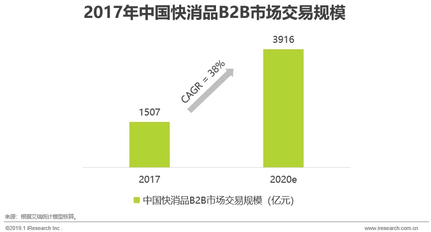 •2017年,中国快消品B2B市场交易规模为1507亿元,市场发展空间广阔。