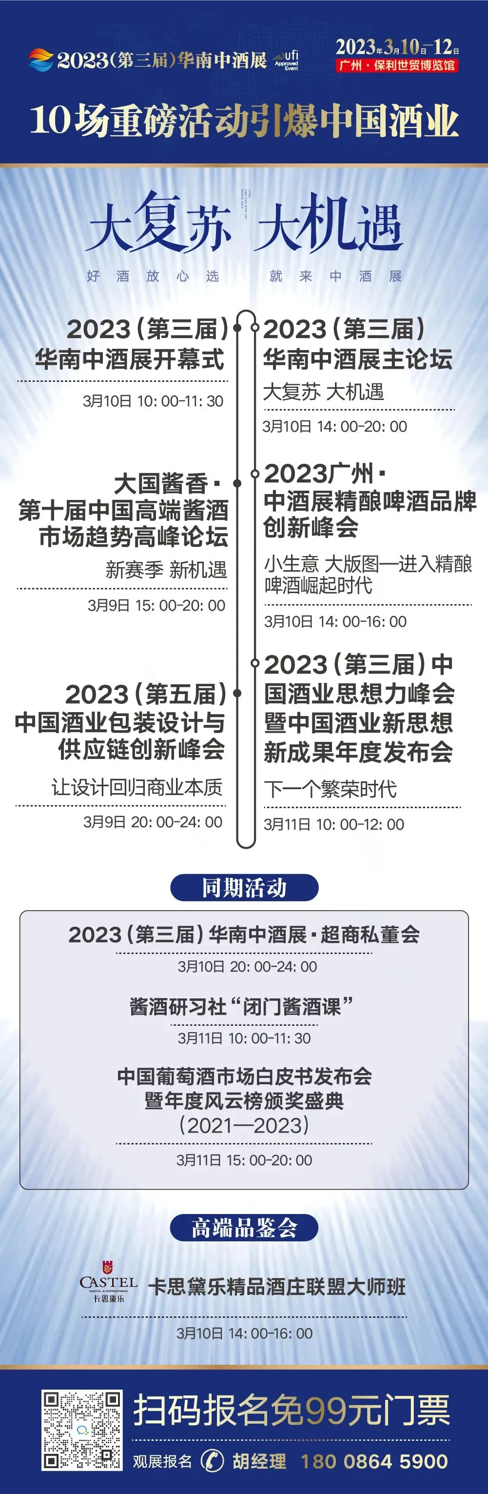 3月10-12日,酒业开年首场行业盛会——以“大复苏·大机遇”为主题的第三届华南中酒展将在广州·保利世贸博览馆盛大启幕,展出面积将达2万平方米,超过200家名酒总部及供应链标杆企业参展,1万余户专业经销商将前来参观选品;同期将举办10余场论坛活动,汇聚100+重磅嘉宾,“2022-2023中国酒业年度产品力颁奖盛典”也将同步举办。