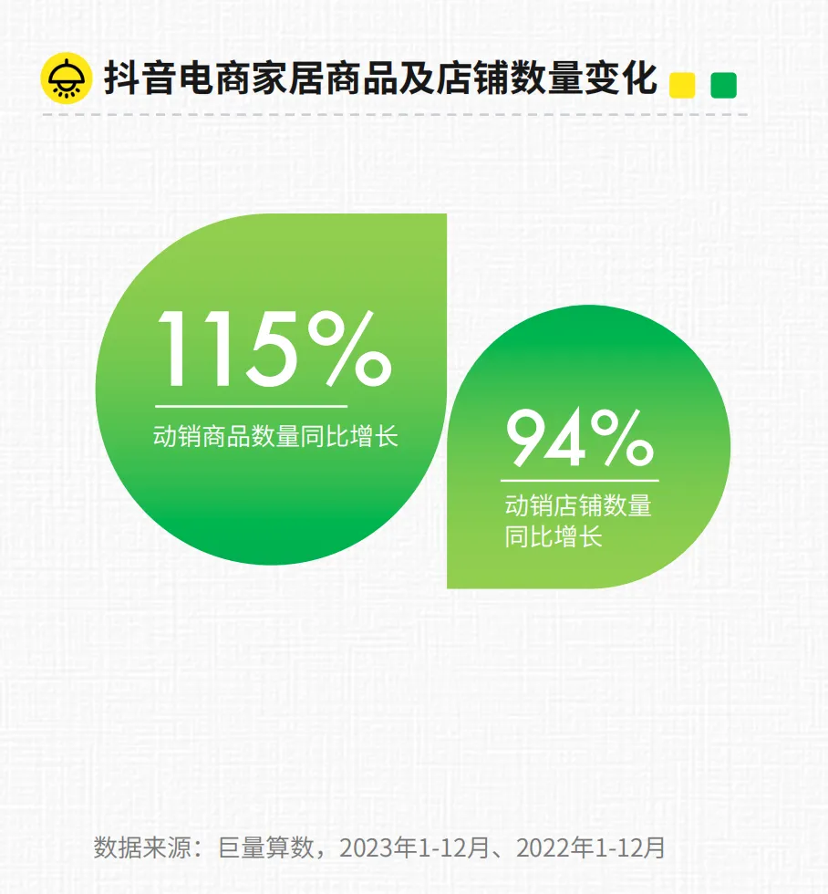 过去的一年,抖音电商平台增速迅猛,2023年家居企业账号直播间数量一年内增长超2倍,动销商品数量增长115%,动销店铺数量增长94%。