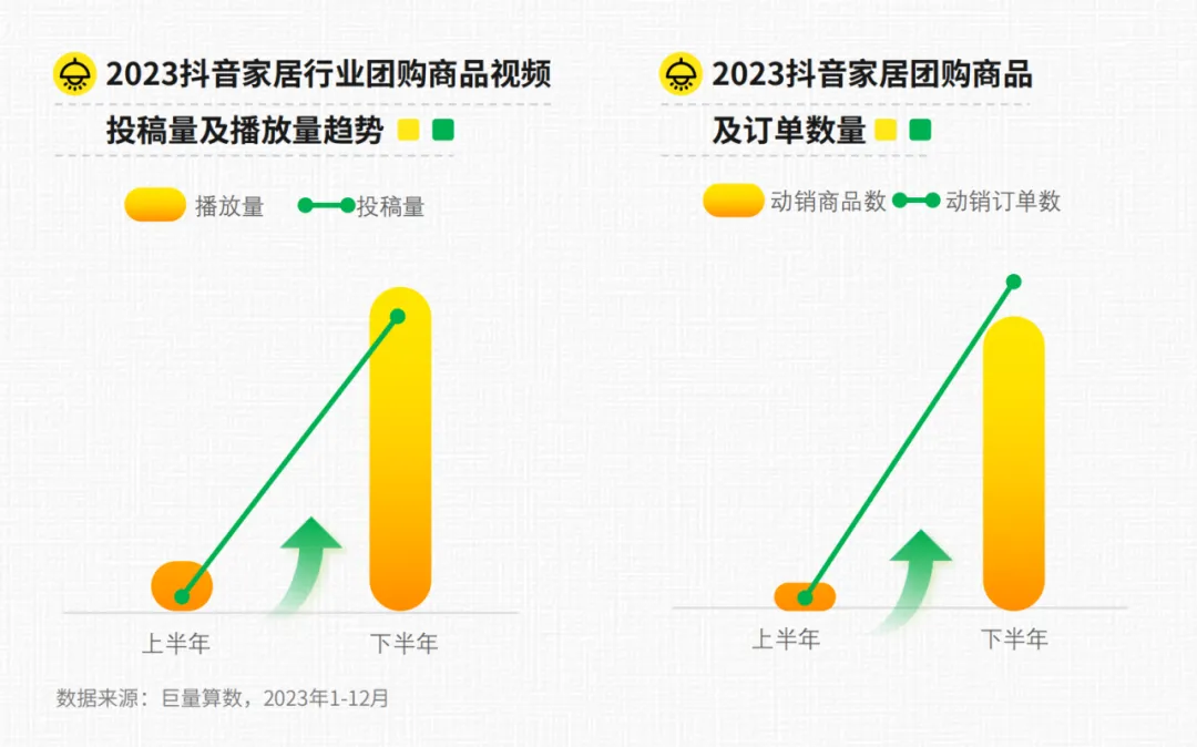 2023年下半年,抖音家居行业本地生活营销爆发,团购视频投稿、播放量、动销商品及订单数均迅猛增长,布艺、厨卫、家具装饰、灯具瓷器等细分市场团购订单增长显著。