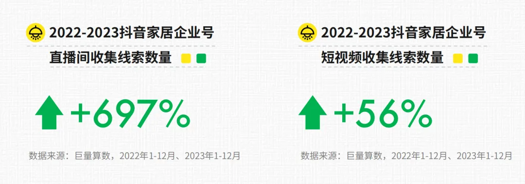 相关数据显示,2022至2023年,家居企业号通过短视频收集线索数量增长697%,直播间收集线索数量增长56%。