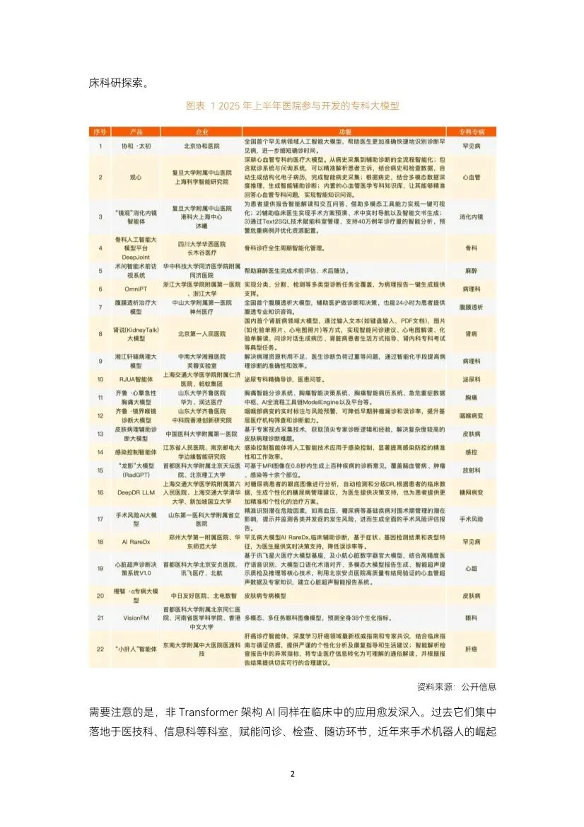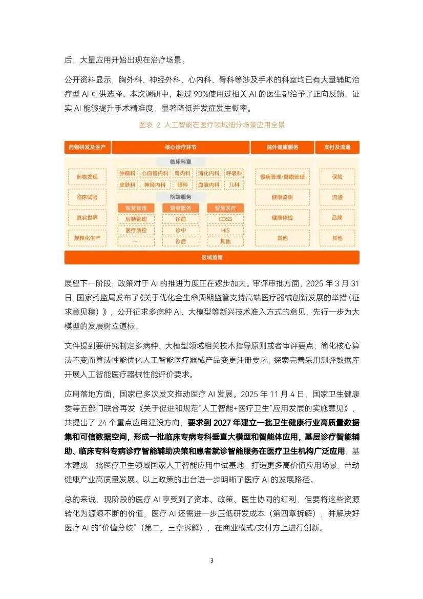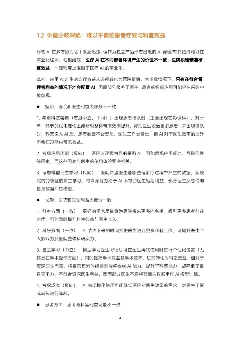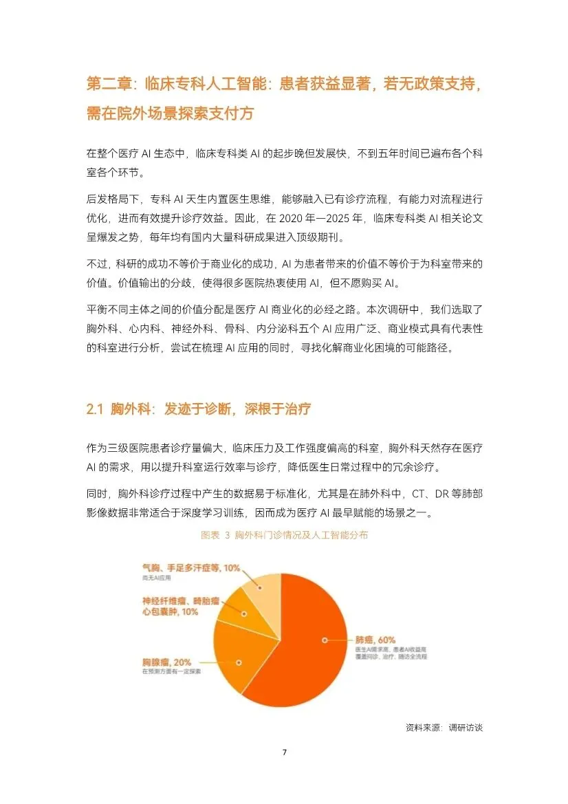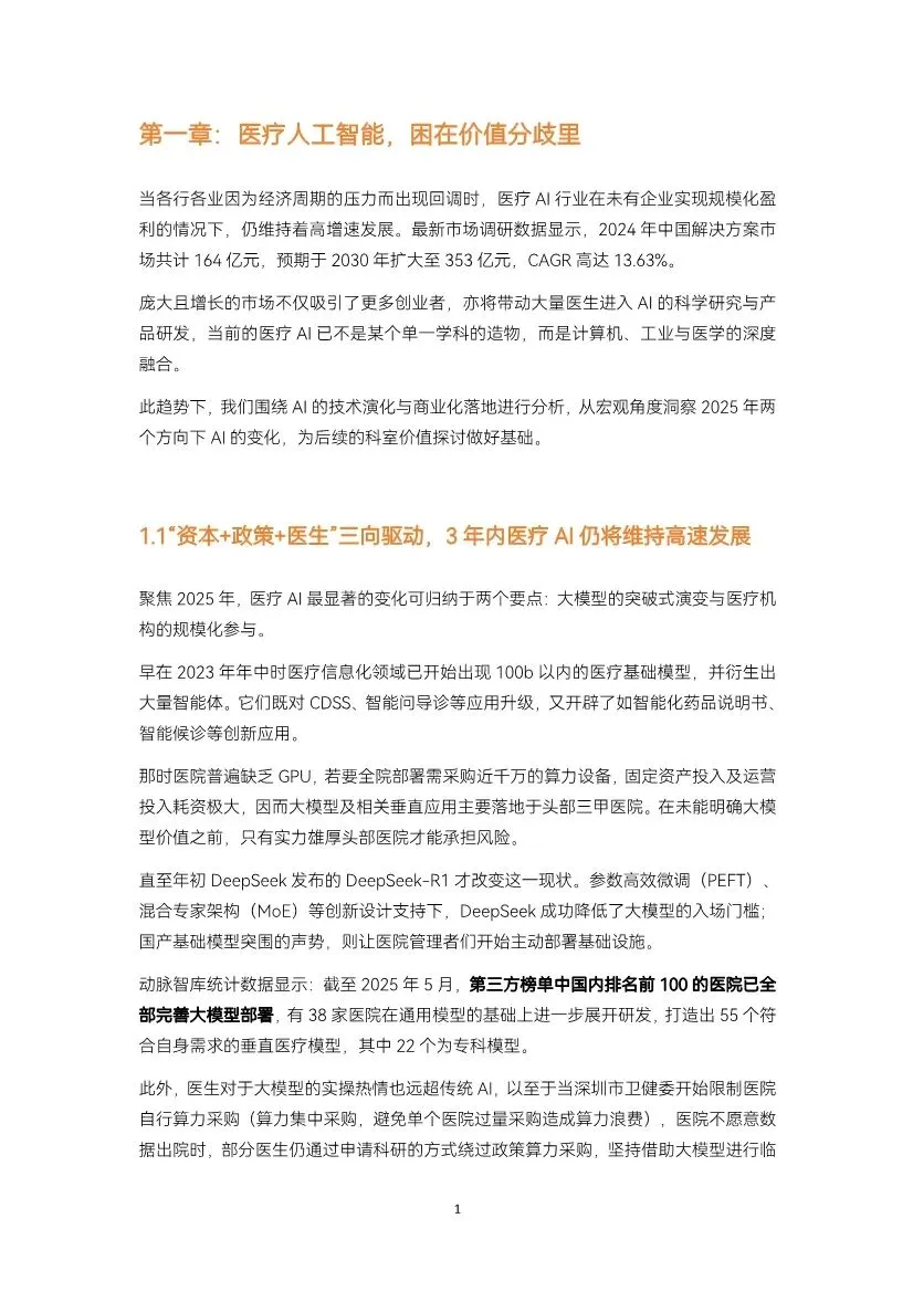 这是一份由蛋壳研究院发布的《2025年医疗人工智能产业报告》,核心聚焦医疗AI的价值计量与支付困局。报告通过深度调研10个科室、访谈30+医生、40+企业,揭示了医疗AI产业"高增速、零盈利"的深层矛盾。市场数据显示,2024年中国医疗AI解决方案市场规模达164亿元,预计2030年将增至353亿元(CAGR 13.63%),但尚无企业实现规模化盈利。根本症结在于价值分歧:AI为患者带来的疗效提升、费用节余,在DRG支付体系下反而可能减少科室收入。医院管理者更关注投资回报周期,而非单纯临床价值。报告深度剖析五个典型科室,揭示应用成熟度与商业化成功度的显著背离:胸外科:肺结节AI诊断效率提升56%-84%,3D重建使住院日缩短58%,但效率提升被术前检查等薄弱环节抵消,DRG规则下缩短住院日可能降低科室收益心内科:"心电一张网"靠政策驱动实现千万级采购,SYNTAX评分AI化成为突破口,但AI延长手术时间、增加射线暴露,不符合医生短期利益。支付转向"器械+AI"捆绑模式,患者自费数万元的高值手术成为商业化载体骨科:AI+3D打印定位导板缩短手术时间60%,手术机器人让过去不敢做的脊柱手术成为可能,直接创造增量手术量(提升10-20%),患者支付意愿强烈,率先实现商业闭环神经外科:AI+3D打印颅骨重建获90-95分满意度,电生理监测缩短手术时间1/3,但手术机器人占比不足5%,高成本制约普及内分泌科:慢病管理AI实现724小时随访,从"效率工具"转向"新增服务",健康管理服务收费编码获批,AI作为"服务投资"被采购核心洞察:唯有创造"增量价值"(如骨科解锁新术式)而非"替代价值",才能打通支付链相比临床科室的价值分歧,医技科AI商业化更成熟,因其价值直接体现为成本节约:影像科:多病种AI准确率>95%,效率提升275%。联影智能AI PACS使归档速度提升5倍,调阅速度提升8倍。国家药监局明确多病种AI审评要点,2-3年内将迎准入潮放疗科:AI靶区勾画效率提升90%,计划设计从20分钟缩至2-3分钟。但自适应放疗费用从1300元涨至3000元,医保覆盖不足成推广瓶颈病理科:宫颈细胞学AI筛查效率提升70%-90%,商业化最成熟。组织病理因需"敏感度近100%",大模型泛化能力与可解释性是关键。广州医科大团队实现病理图像预测基因突变,准确度78%-99%检验科:形态学AI减轻镜检负担,微生物检验通过二代测序跳过培养环节,实现全自动化信息科:从成本部门转向价值创造。低代码平台+AI使设备接口开发效率提升90%,AI EMR实现病历生成效率提升30%,质控覆盖率从10%提至100%基层是唯一实现三方共赢(机构、医生、患者)的场景,也是商业化最成功的领域:- 政策刚性:卫健委要求2025年底县域诊所AI覆盖率≥80%,与医保定点挂钩,财政按50元/年/居民补贴慢病管理AI- 模式清晰:SaaS订阅、按使用量计费、政府购买、收益分成等多元模式,头部企业续约率>80%- 规模验证:讯飞医疗智医助理覆盖7.7万家基层机构,累计11亿次辅诊建议,2025年4.28亿元中标国家级AI中试基地项目成功逻辑:政策强制+财政托底+技术适配+刚需匹配,系统性破解基层"缺人、质量弱、效率低"痛点报告提出,数据治理成本占AI研发投入30%-50%,是最大可压缩项。数据资产化成为可持续增长最优路径:智能化治理:生成式AI自动完成数据清洗、标注、质控,效率提升5-10倍,准确率>95%。水木金昇SaaS平台服务100+企业,孵化10余款AI器械,将"血药浓度软件"研发周期缩短至6个月场内交易:数据清洗(50-60元/CT)+律所评估(5-6万元)+确权(数千元),单数据集成本约10万元。宣武医院颈动脉支架数据集、一脉阳光CT病变数据集在北数所完成交易。但供给不足,核心障碍是权属复杂、定价困难、标准不统一可信数据空间:北电数智"红湖"数据空间实现"可用不可见、可控可计量",支持密码学密文计算。上海数据交易所幽门螺杆菌数据空间采用"2+3+4"模式,构建跨组织流通环境。但"大模型+数据空间"技术复杂度高,案例稀缺伦理挑战:医疗数据归属权属于患者,机构仅有管理权。现有知情同意书未明确"商用授权",医疗机构不愿承担风险。需2-3年完善法律框架或修改协议深睿医疗:从单点影像AI升级为"影像+文本"双引擎全栈生态,Deepwise MetAI X实现"全流程数智化",牵头13项国家重大专项东软集团:"添翼2.0"构建"治理-知识-模型"全链路,在武大中南医院实现单科日均500份出院小结自动生成,入选国家数据局首批项目京东健康:京医千询2.0从"路径驱动"升级为"循证智能",与安贞共建心血管大模型(超声诊断合理率90%),AI医院服务1.5亿用户水木金昇:专注医疗器械CDMO,SaaS平台将研发文档、风险验证连接为可追溯闭环,6个月完成全流程注册悦唯医疗:临床专家团队打造全球首款SYNTAX智能评分系统,50%研发时间用于医学知识"编码化",无一例漏诊联影智能:AI PACS实现"阅片+报告"双融合,北医三院日均处理4000例,归档速度提升5倍讯飞医疗:星火大模型覆盖7.7万家基层机构,与安贞共建心血管大模型,胎儿先心病诊断合理率85%北电数智:"星火·医疗底座"构建可信数据空间,与中日友好医院合作,病历书写效率提升75%伽奈维医疗:穿刺机器人CR-NAV100调整≤2次成功率76.5%(传统25%),CT扫描次数减少35%,毫米级定位实现规模化商业落地西门子医疗:syngo.via全球装机15555例,与协和医院合作使主动脉测量从10分钟缩至2分钟,Cinematic Reality Plus裸眼3D提升医患沟通效率价值重构:从效率工具转向决策伙伴。大模型推动AI从"判别式"走向"生成式",实现可解释性突破,专科