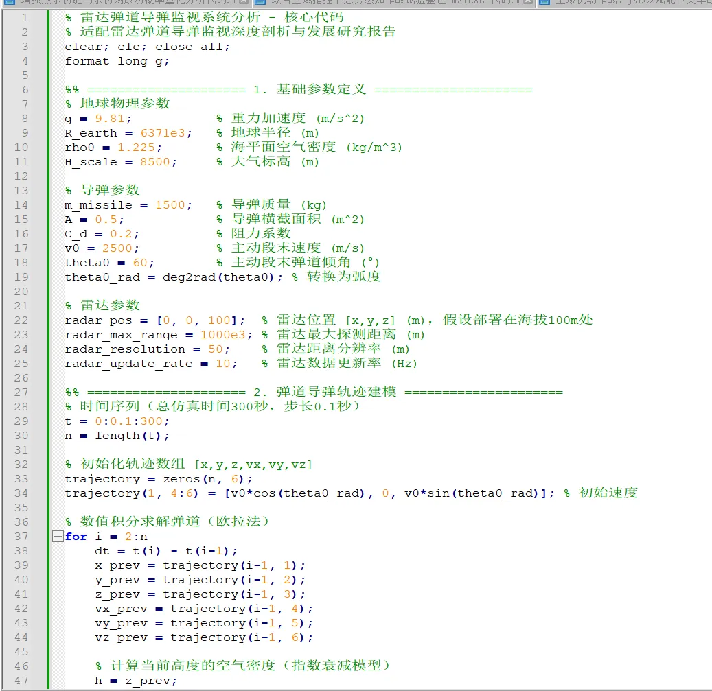 雷达弹道导弹监视系统分析与发展研究的 MATLAB 代码,核心需求应该是实现弹道导弹轨迹建模、雷达探测仿真、数据处理分析等关键功能,用于支撑研究报告的量化分析和可视化展示。