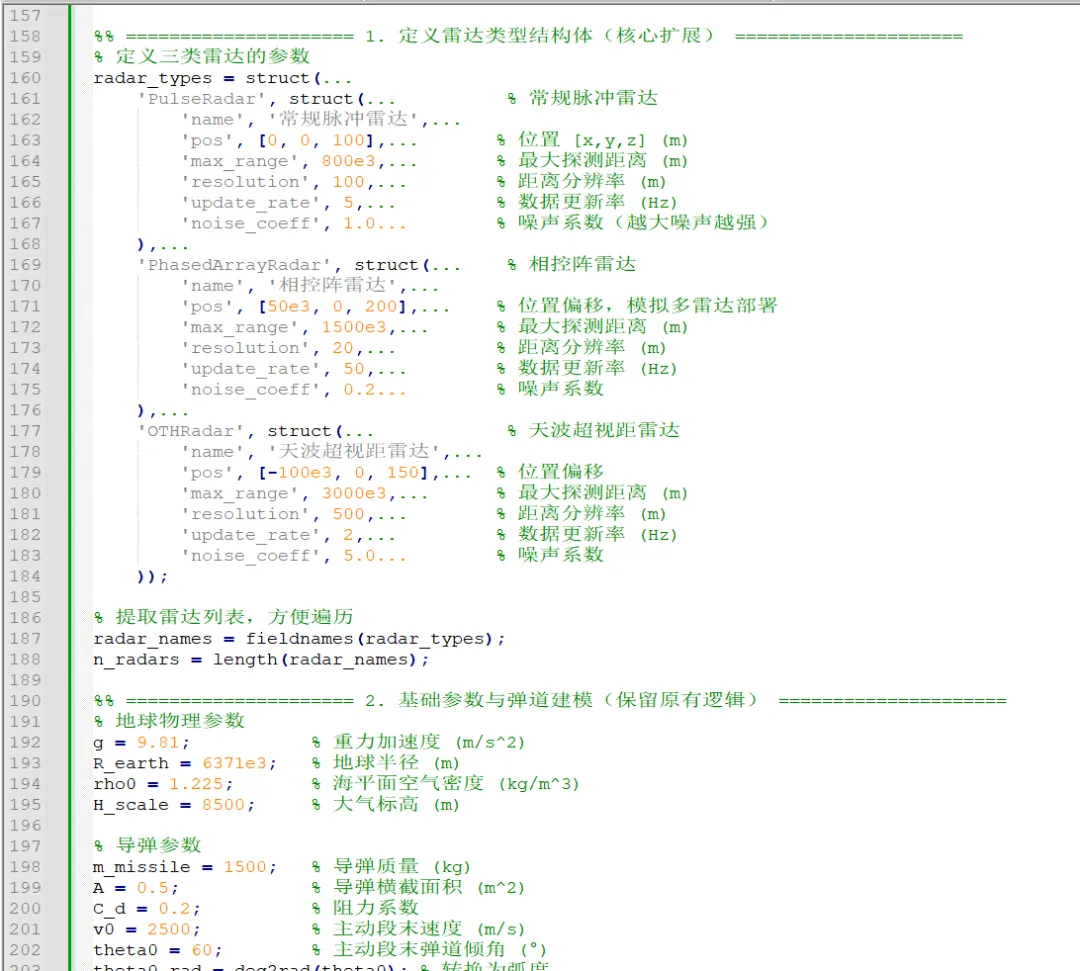 以下我将分模块提供完整的 MATLAB 代码,涵盖弹道建模、雷达探测仿真、数据可视化与性能分析,代码注释详尽,可直接运行并适配研究报告的需求。