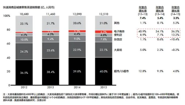 电商及便利店增长强劲,超市面临增速放慢,而大卖场的销量甚至开始下滑。