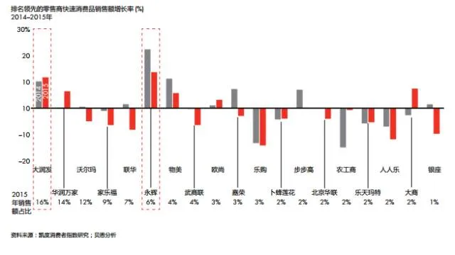 图7:在排名领先的零售商中,大润发和永辉超市在2015年销售额增长最为强劲