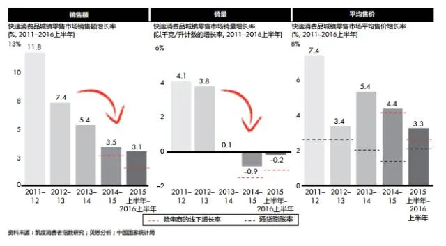 图2:在销量下滑和价格增长缓慢的形势下,快速消费品的整体增长率约为3%