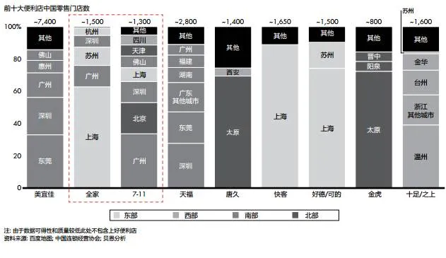 图9:前十大便利店零售商中,除全家和7-11在全国一线城市布局,大多数为区域性布局