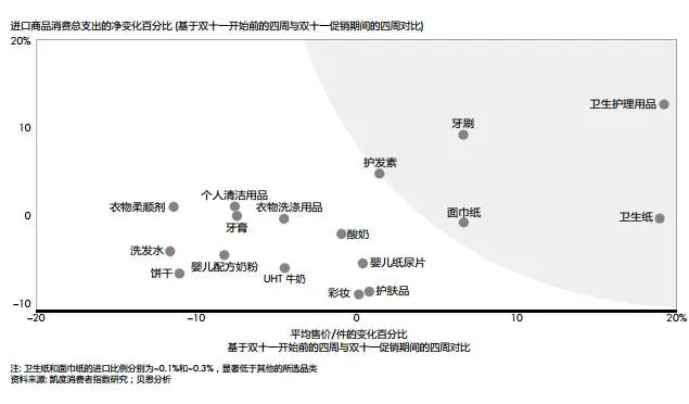 双十一活动不仅仅是打折促销,它同时也提升了如卫生护理用品、牙刷等品类的平均售价(见图20)。无论什么品类,促销活动中显现出高端化的趋势并不常见,我们认为这一现象的原因是更多的进口商品在双十一活动期间被推广和销售。例如,进口卫生护理用品和牙刷在双十一期间销售份额实现了两位数增长。 与此同时,卫生纸和面巾纸品类的领导品牌维达,利用双十一活动对其高端产品进行推广,进一步迎合了双十一活动的高端化趋势。