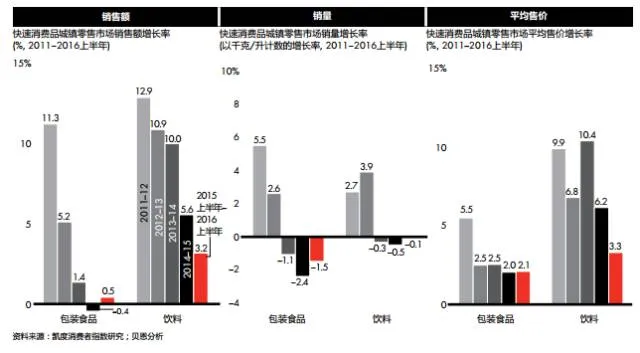 自2014年底以来,快速消费品行业的包装食品与饮料、家庭与个人护理品类呈现了不同的增长态势(见图1)。 今年上半年,城镇地区快消品零售额与2015同期相比增长3%,销量下降0.2%,平均售价上涨3.3%(见图2)。