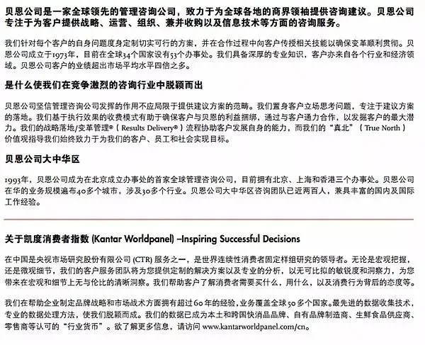 本报告由贝恩公司(Bain & Company)与凯度消费者指数(Kantar Worldpanel)共同完成。报告的作者特别感谢贝恩公司的邢微微、姜珊、陈悦以及凯度消费者指数的李嵘、秦怡和张惠珺为本报告做出的贡献。