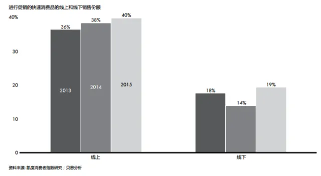 中国消费者在线上购买更多品类的同时,也不断转向线上购买进口产品。数据显示,进口快速消费品在线上购买的可能性比线下高四倍(见图15)。大约三分之二的线上零售为进口产品和促销产品,这是线下进口产品和促销产品市场份额的两倍。对中国的零售商而言,促销这一手段变得越来越重要。我们研究发现,2015年间40%的线上快消品是在促销期间售出的,而线下渠道的促销销量占比只有19% (见图16)。