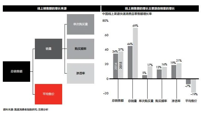 线上快速消费品的强劲增长主要源自于销量的大幅提升。数据显示,2015年线上销量增长了69%,即网购 者购买更多的产品,更频繁地访问购物网站,并在线上购买更多的品类(见图13)。销量的增长甚至抵消了平均售价的下降(线上购物的平均售价在2014和2015年分别下降了7%和19%)。