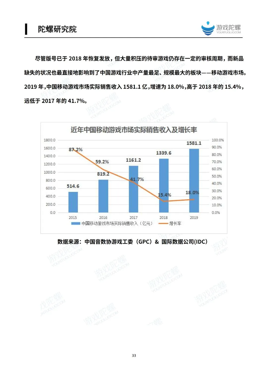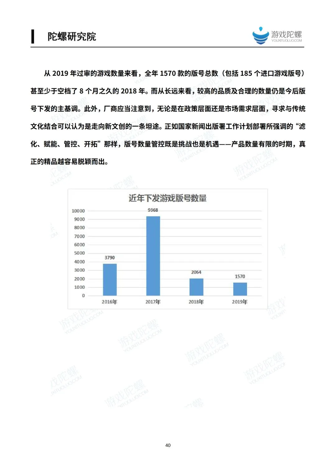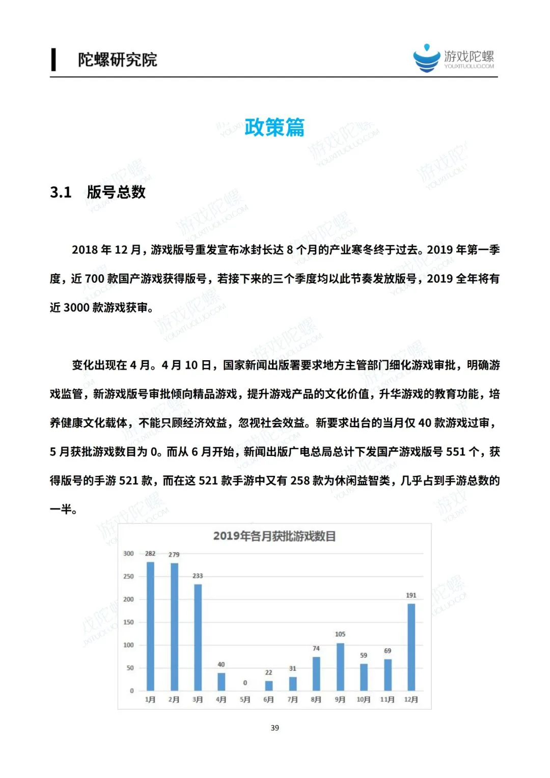 2019年,总计1570款游戏过审(包括185个进口游戏版号),获批数目甚至不及版号暂停发放了8个月的2018年。若按单月计算,2019年4月国家新闻出版总署要求地方主管部门细化游戏审批工作以来,9个月获批游戏的数量仅为776款,尚不及全年版号总量的一半。受版号政策收紧影响,资本市场对游戏行业的投资热情也开始全面消退。2019年前11个月,游戏业仅发生35起投融资事件,涉及金额跌落至60余亿元。缺融资,无版号,众多游戏厂商在2019年集体陷入了产品荒。但好消息并不是完全没有。2019年,中国移动游戏市场实际销售收入增速达18%,高于全球手游市场14.8%的增速,中国手游市场增量空间依然可观,此外,随着行业相关规范政策的陆续出台,一个秩序井然的时代正逐渐到来。针对国内手游市场,本篇我们将从版号、政策、资本等维度解读2019年国内手游发展情况。在本微信公众号后台回复“产业报告”即可获取报告完整版下载链接投稿邮箱:tougao@youxituoluo.com