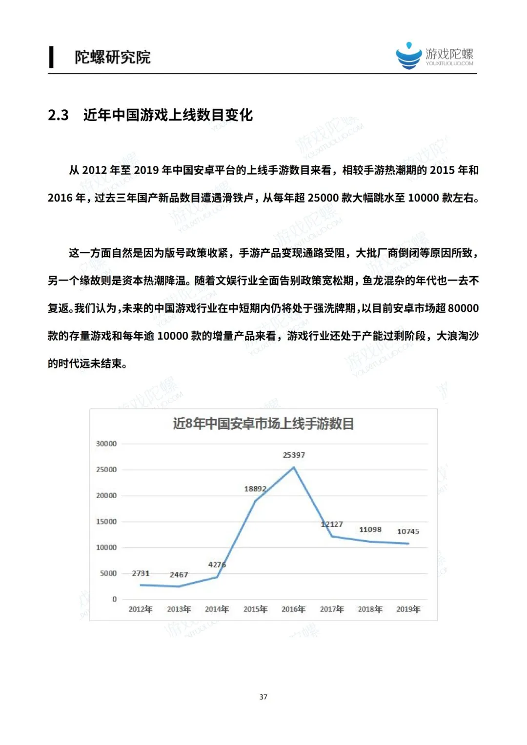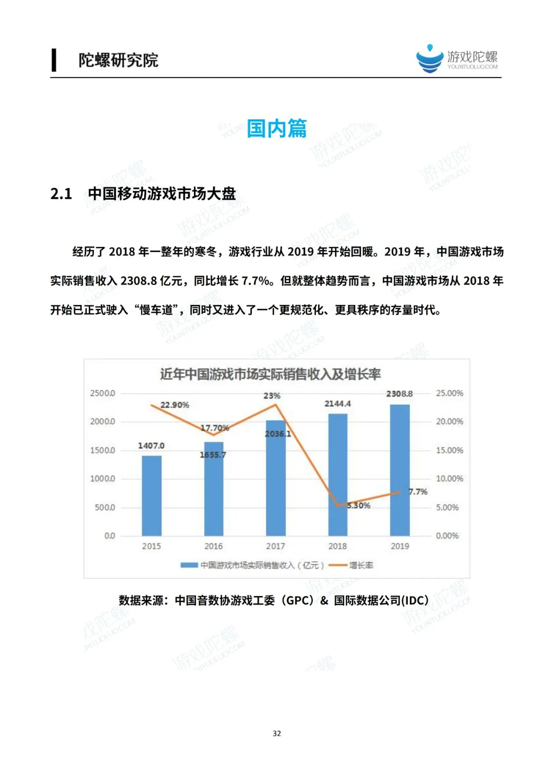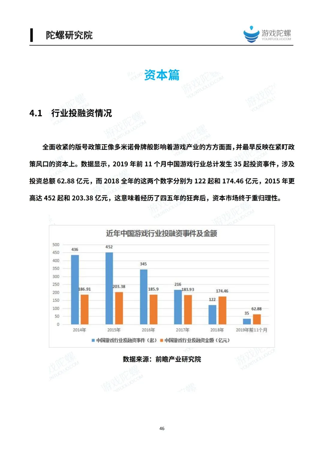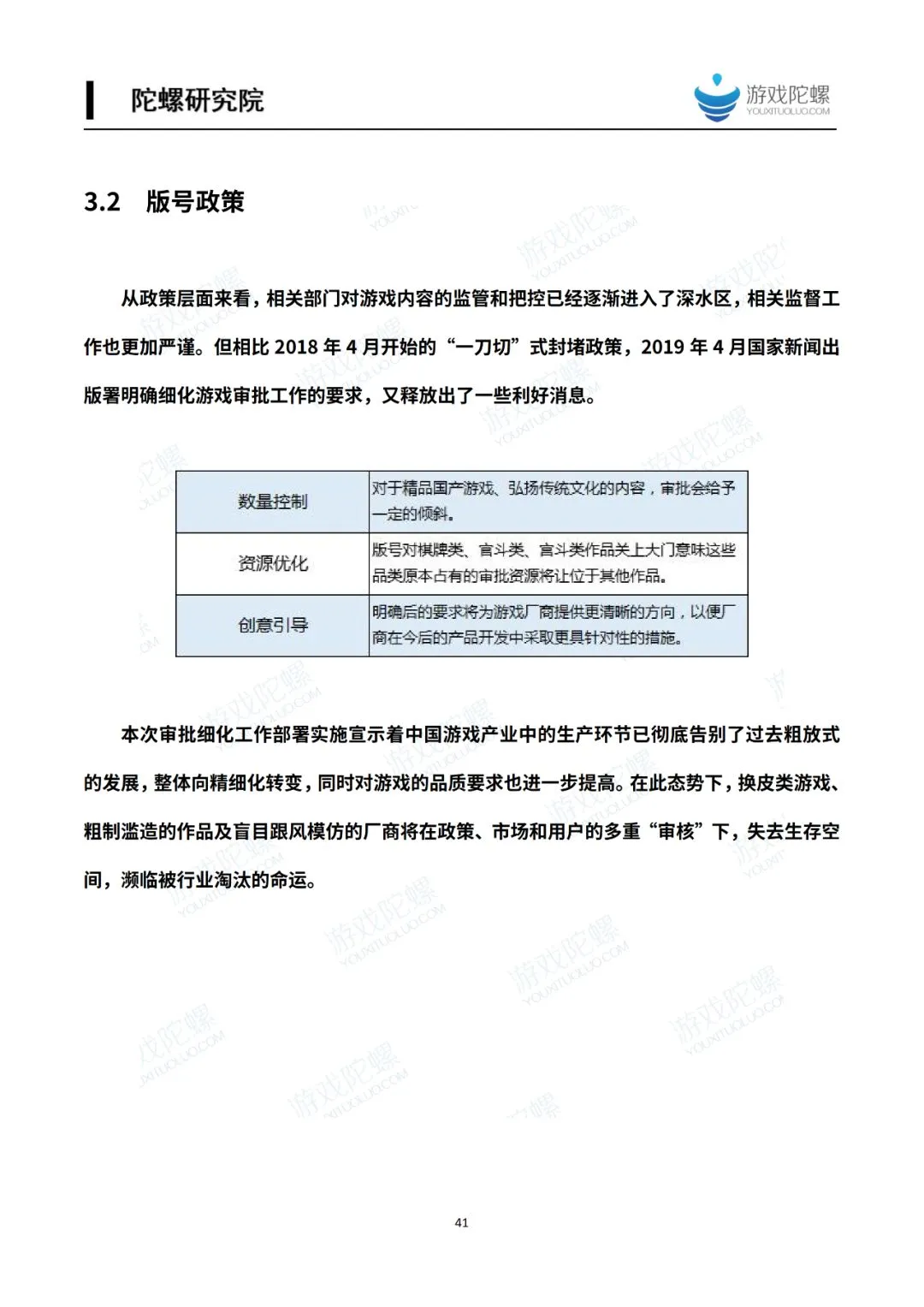 2019年,总计1570款游戏过审(包括185个进口游戏版号),获批数目甚至不及版号暂停发放了8个月的2018年。若按单月计算,2019年4月国家新闻出版总署要求地方主管部门细化游戏审批工作以来,9个月获批游戏的数量仅为776款,尚不及全年版号总量的一半。受版号政策收紧影响,资本市场对游戏行业的投资热情也开始全面消退。2019年前11个月,游戏业仅发生35起投融资事件,涉及金额跌落至60余亿元。缺融资,无版号,众多游戏厂商在2019年集体陷入了产品荒。但好消息并不是完全没有。2019年,中国移动游戏市场实际销售收入增速达18%,高于全球手游市场14.8%的增速,中国手游市场增量空间依然可观,此外,随着行业相关规范政策的陆续出台,一个秩序井然的时代正逐渐到来。针对国内手游市场,本篇我们将从版号、政策、资本等维度解读2019年国内手游发展情况。在本微信公众号后台回复“产业报告”即可获取报告完整版下载链接投稿邮箱:tougao@youxituoluo.com