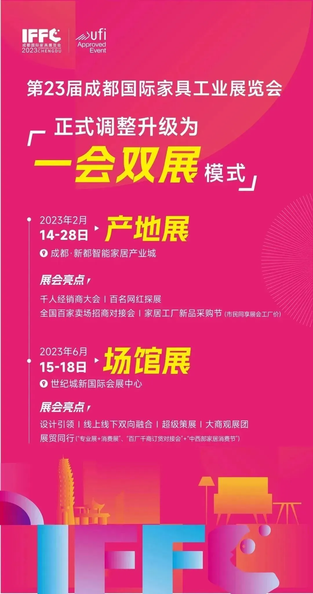 国内家居行业春天已来!作为中国家居内贸首选平台、中国三大家具展会之一、国际展览业协会(UFI)认证展会,创新“一会双展”模式的第23届成都家具展,将于6月15-18日在成都世纪城新国际会展中心再度重磅启航。