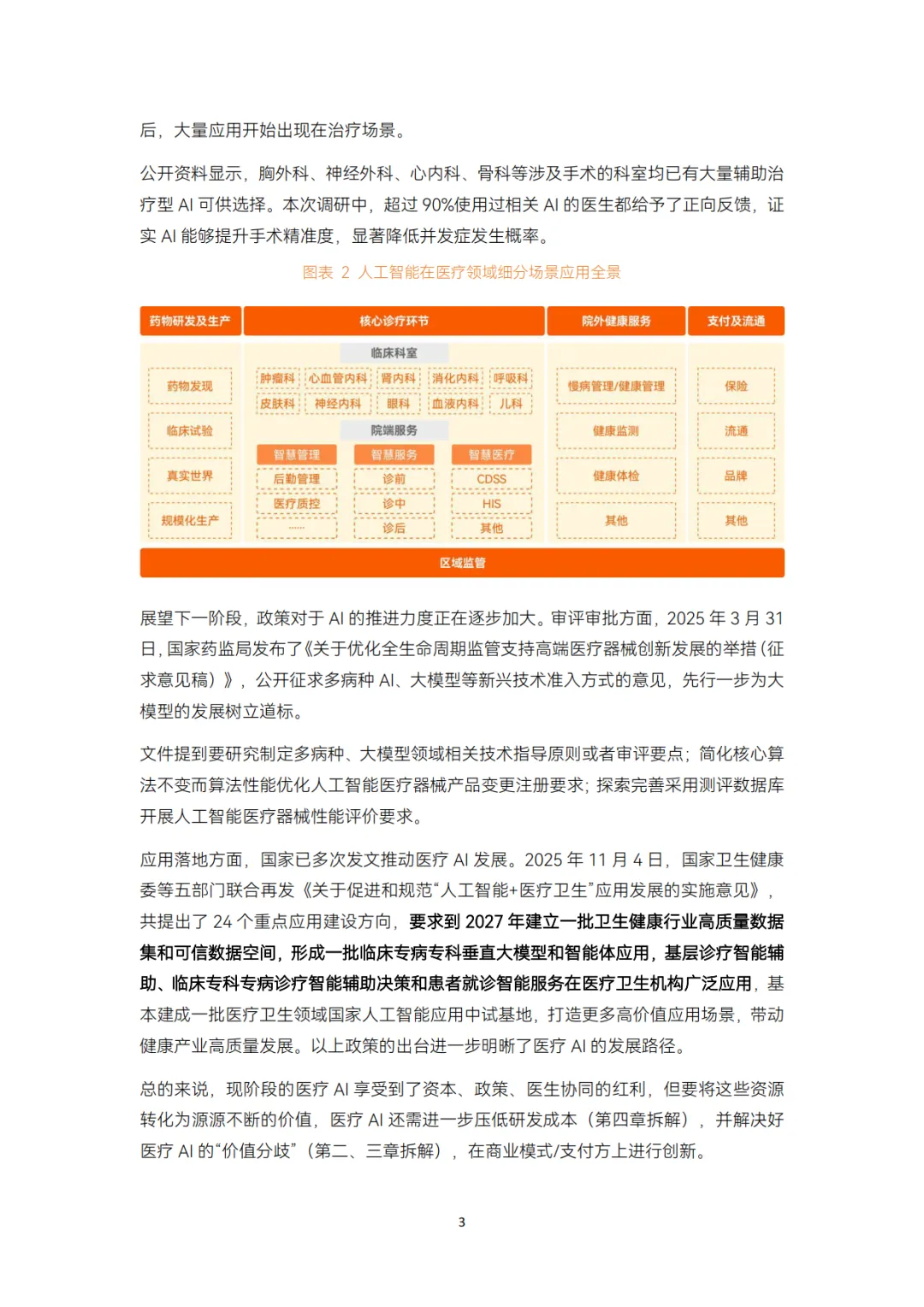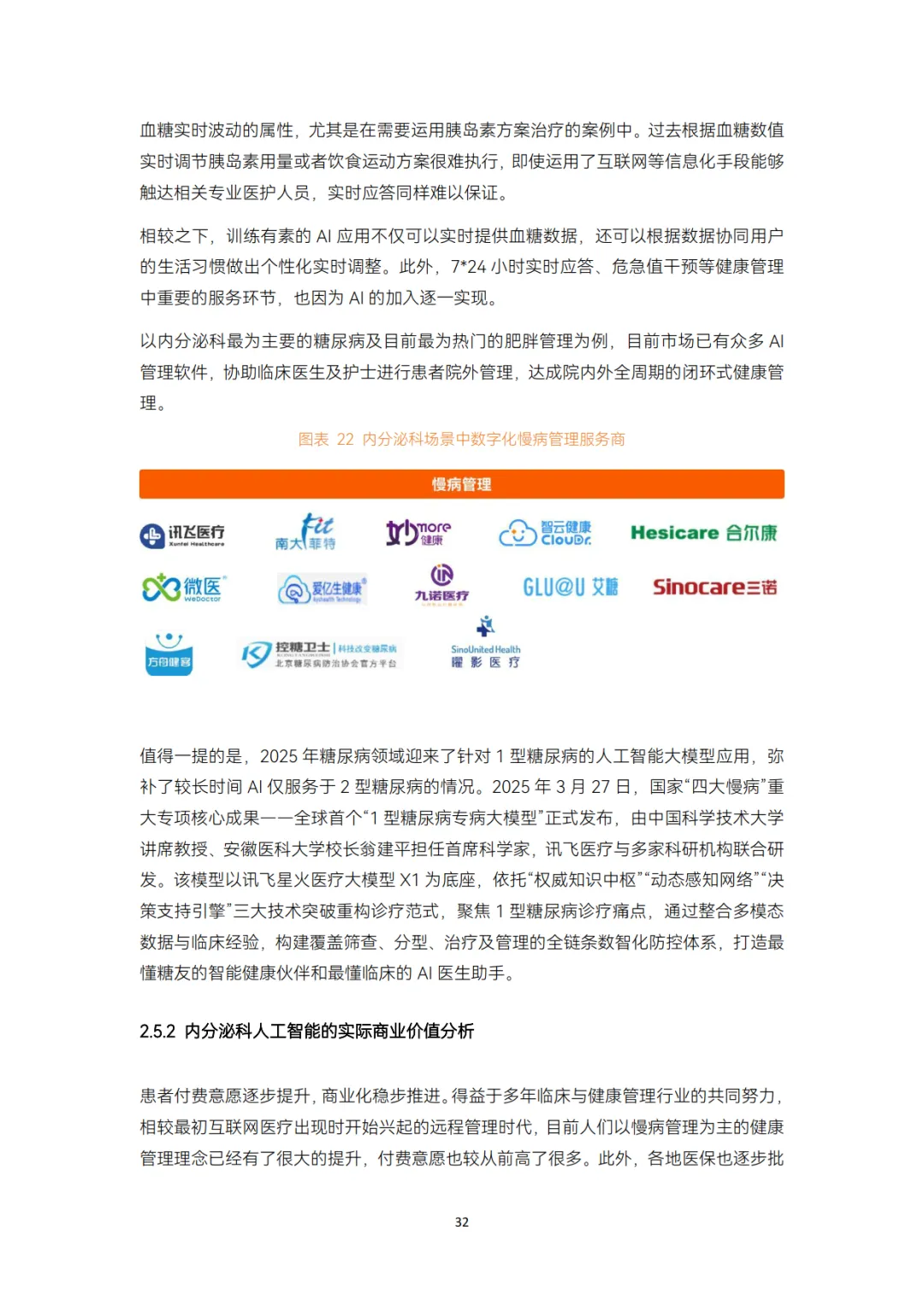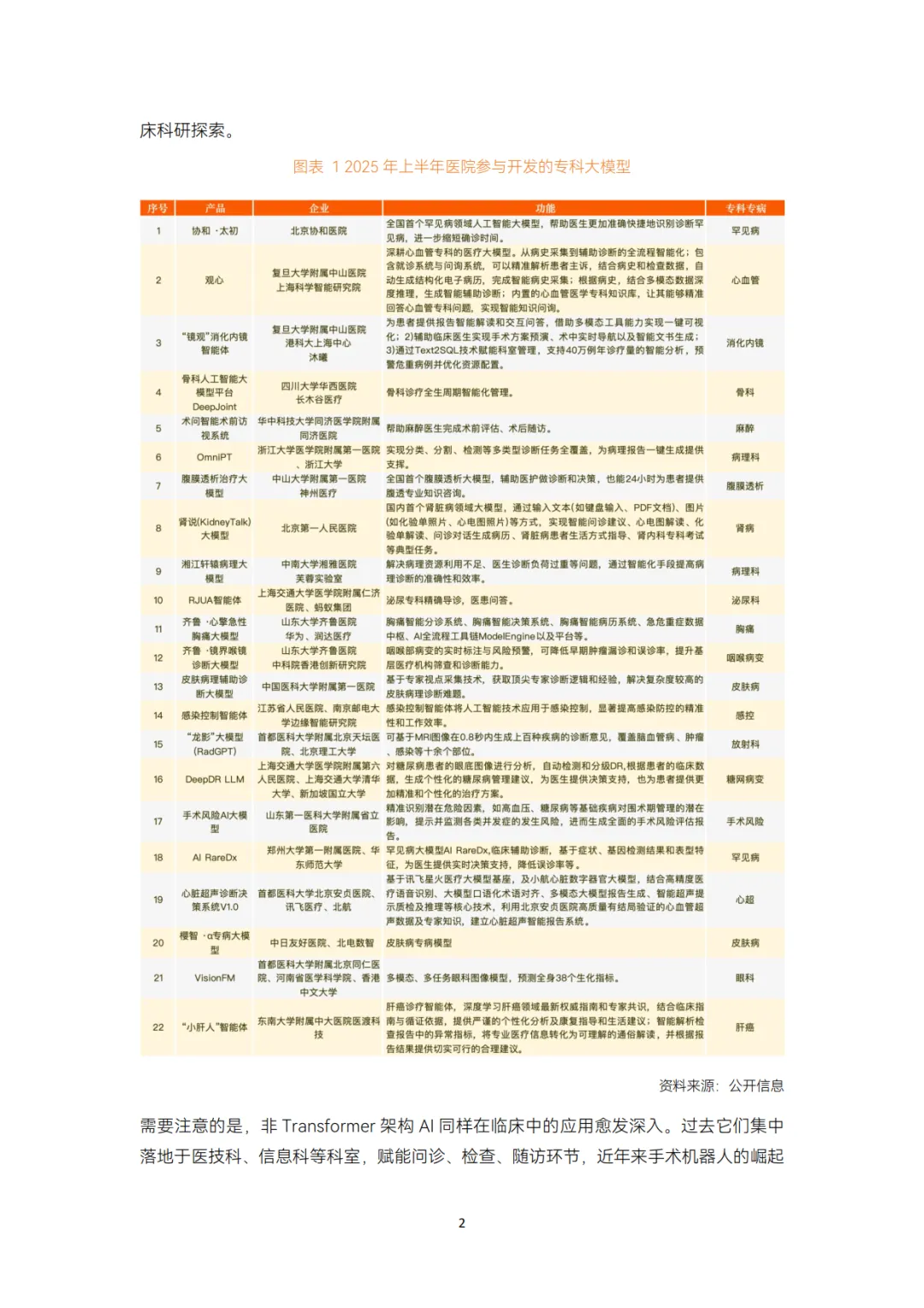 大模型技术降低应用门槛,国内前100家医院已全部部署大模型,38家医院研发55个垂直医疗模型。AI从辅助工具升级为“核心生产力”,在影像诊断、慢病管理等领域准确率提升至92%。
