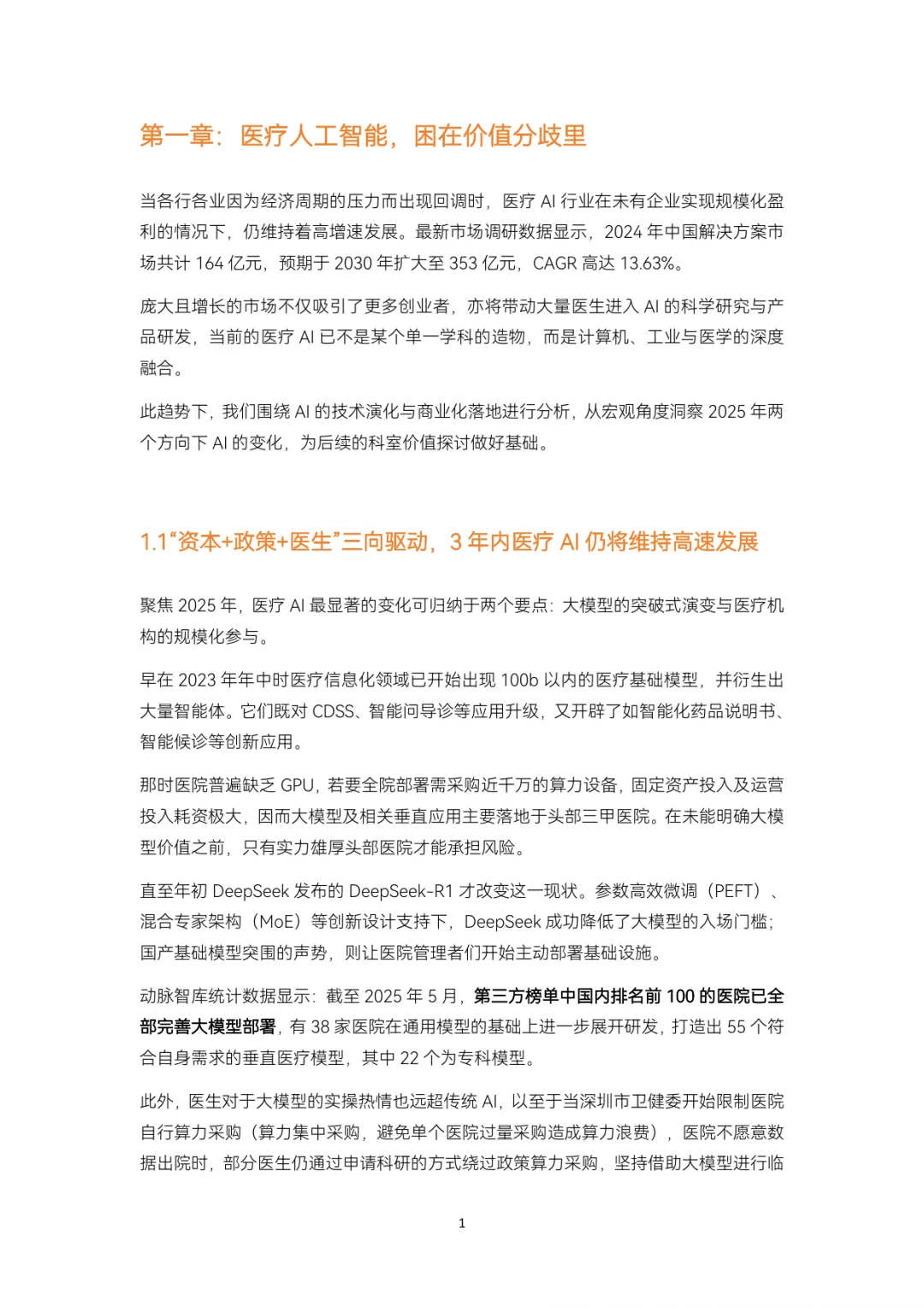 2024年中国医疗AI解决方案市场规模达164亿元,预计2030年将扩大至353亿元,年复合增长率13.63%。增长核心源于政策支持(如五部门联合发布AI医疗应用发展实施意见)、资本投入及医生参与度提升。