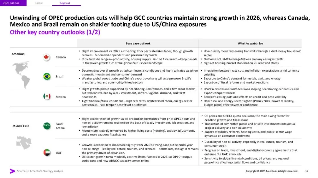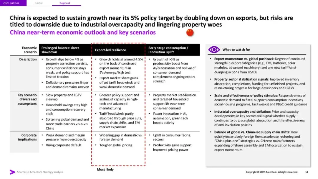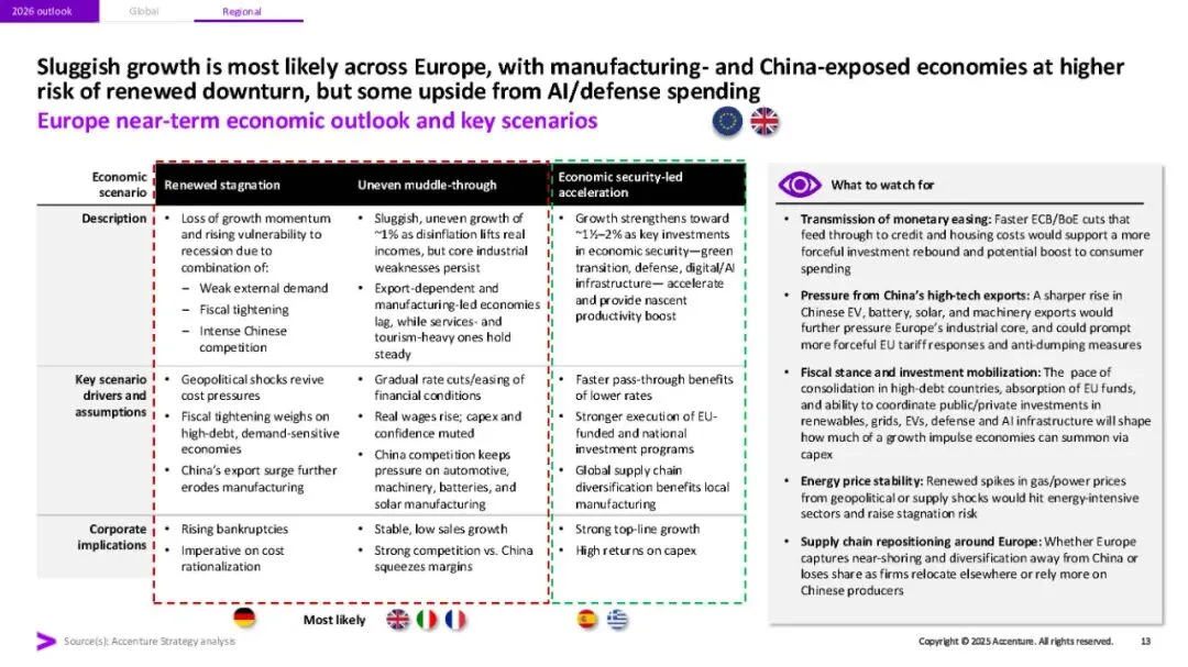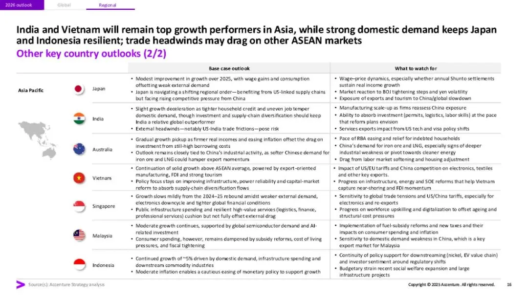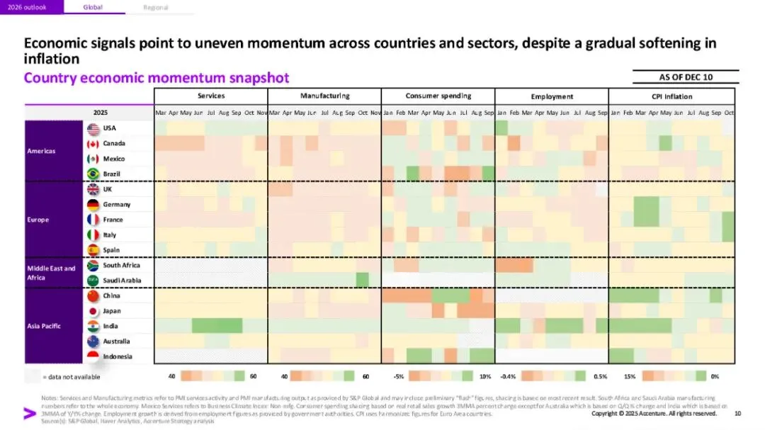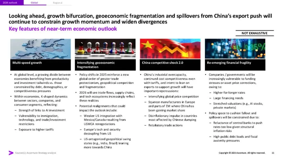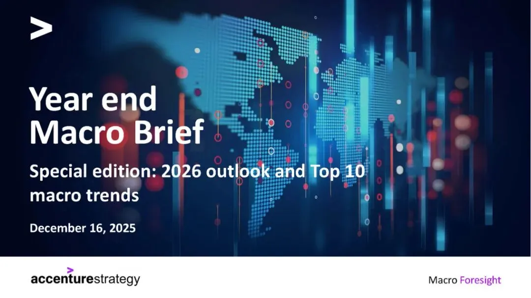 埃森哲《2026年全球经济展望与十大宏观趋势》研究报告指出,2026年全球经济将呈现增长不均、脆弱性上升的态势。报告强调四大关键特征:多速增长(AI受益行业与债务约束行业差距拉大)、地缘经济碎片化加剧、中国竞争冲击2.0(出口推动带来全球价格压力),以及金融脆弱性重现。