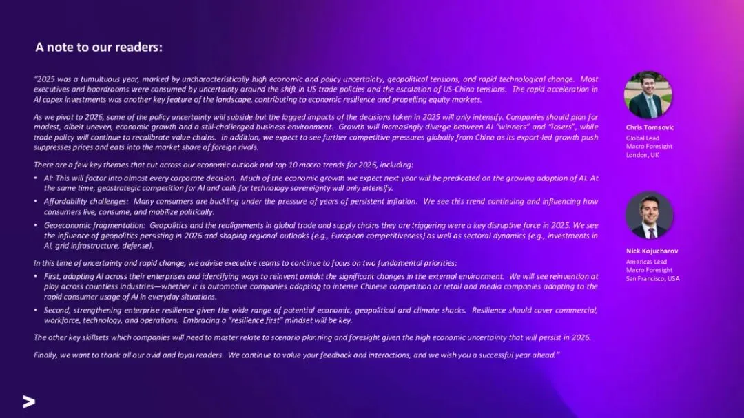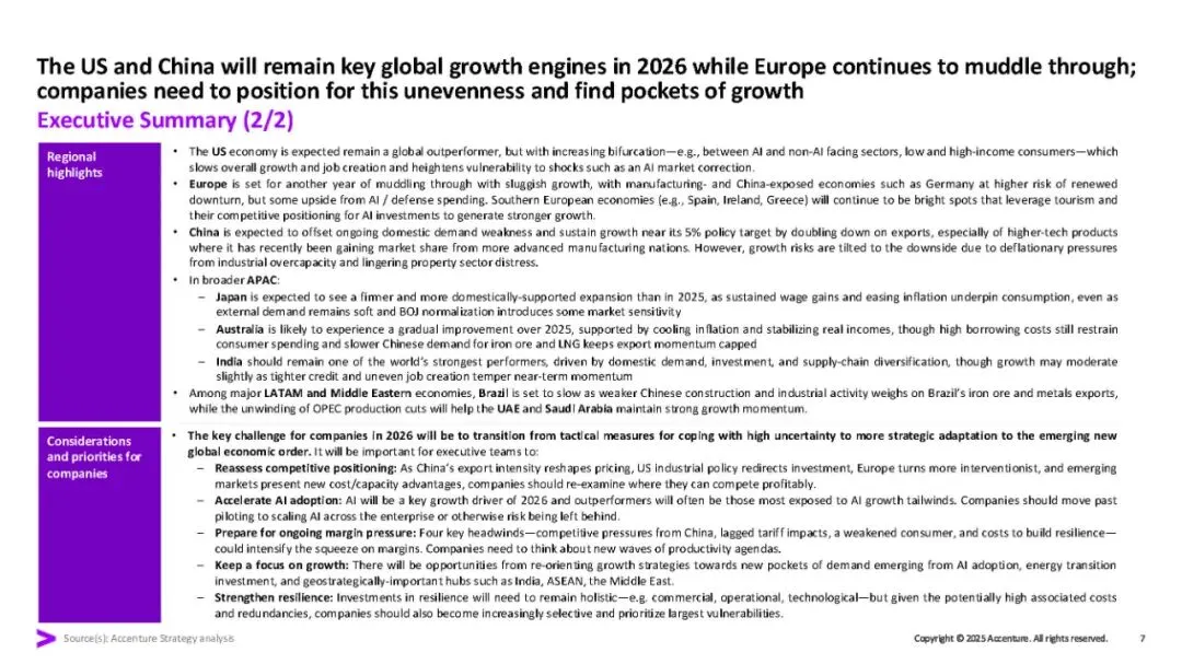 报告建议企业应加速AI全面应用、加强韧性建设、调整全球布局以应对结构性挑战,并在增长与韧性、规模化与本地化之间寻求平衡。