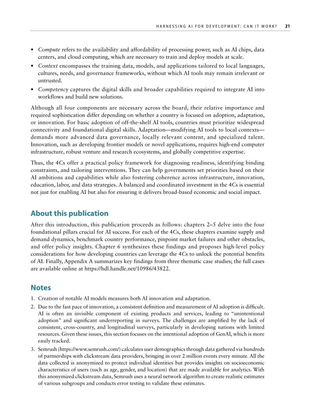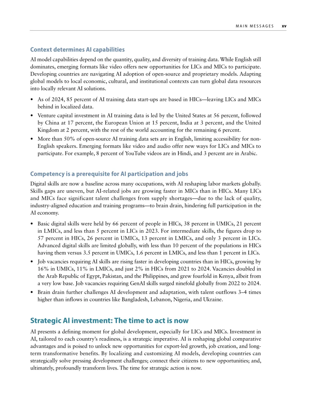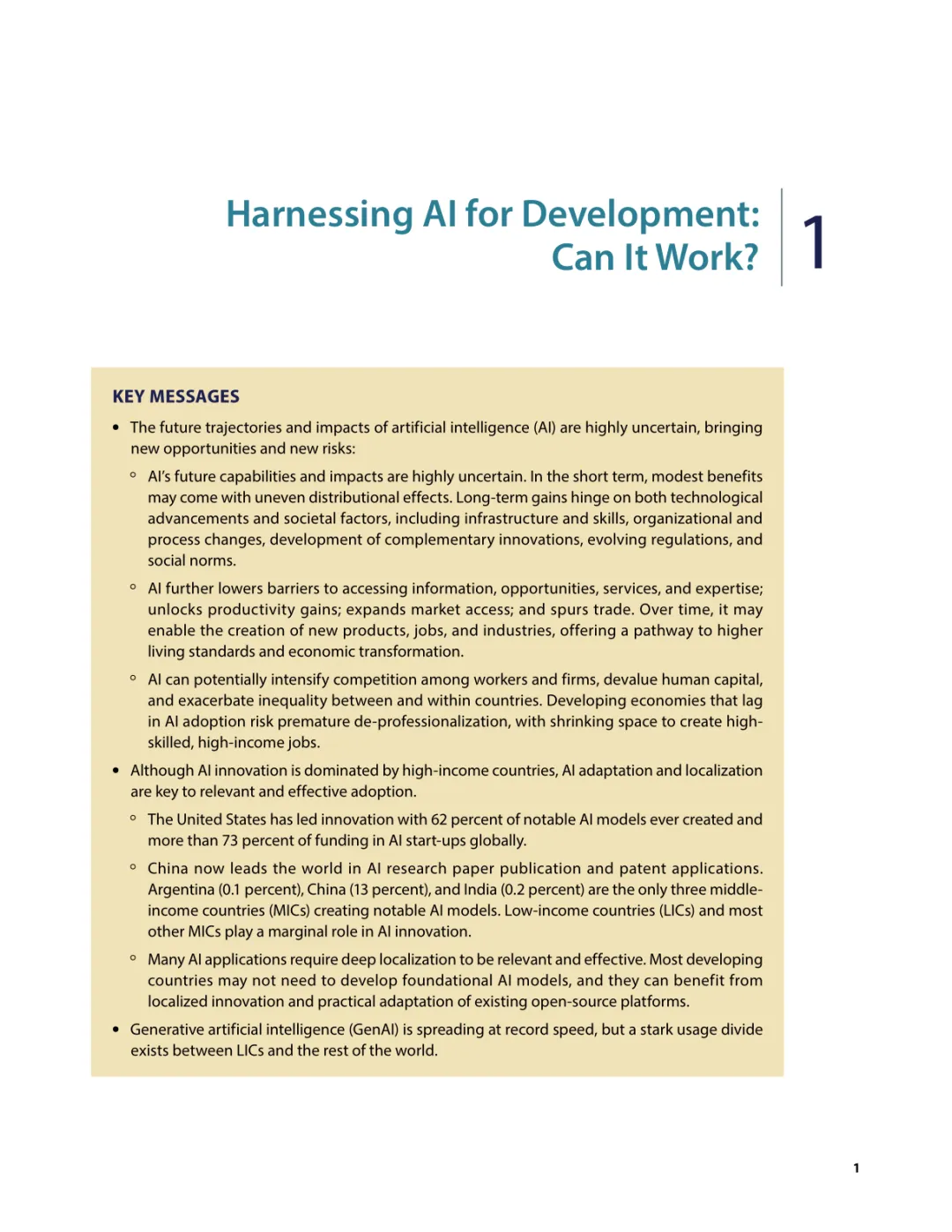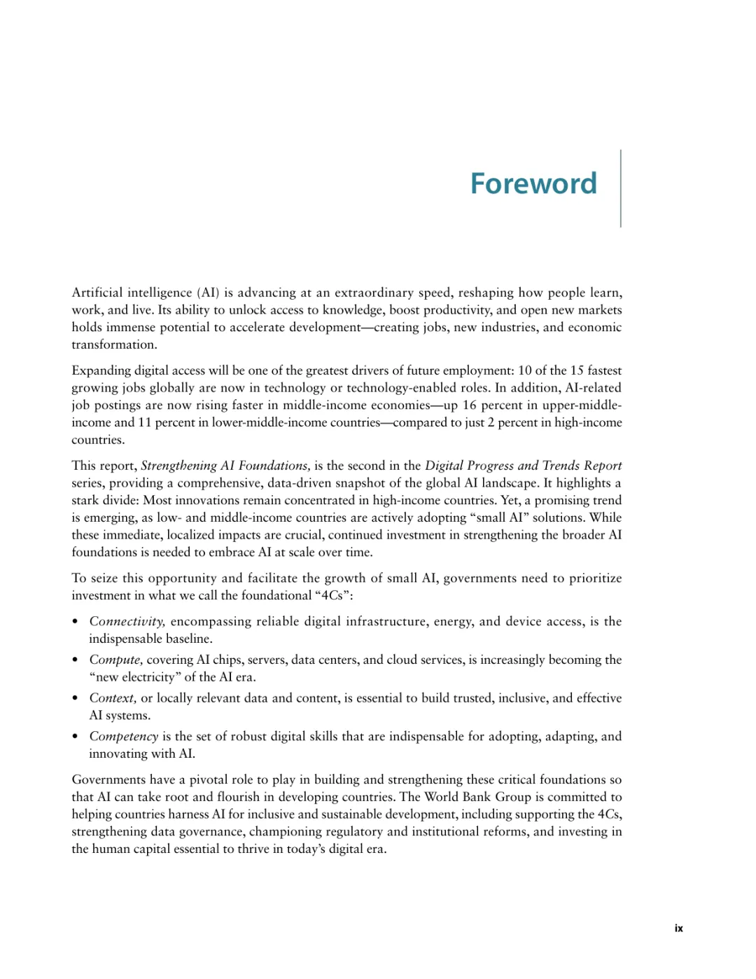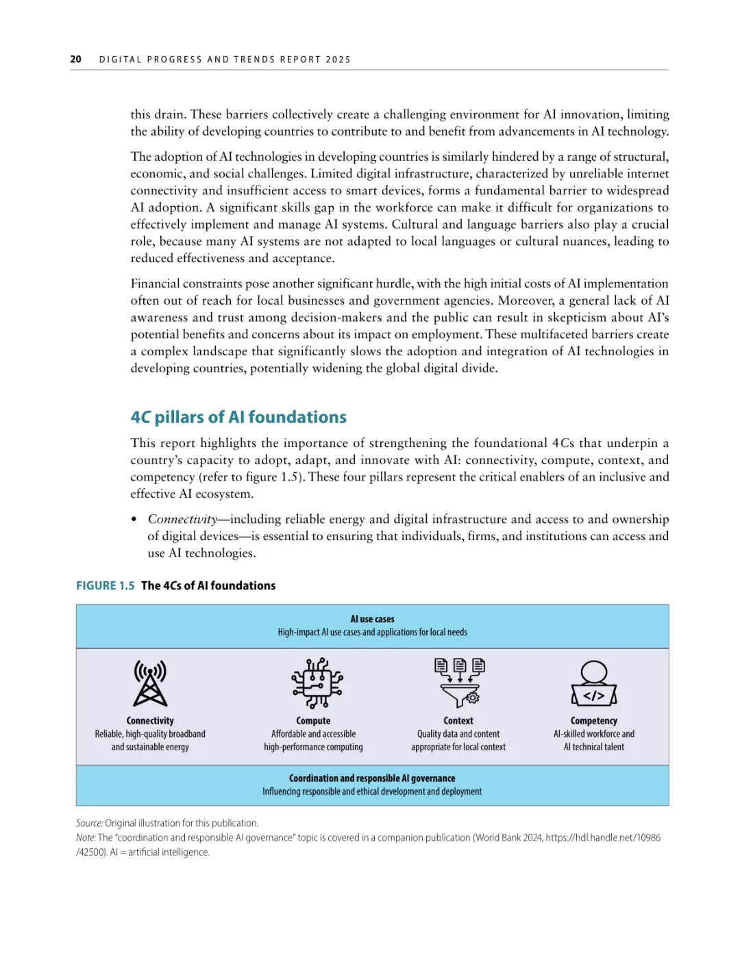 导读:报告聚焦人工智能发展基础建设,提出 “连接、算力、场景、能力” 四大核心支柱,为低收入和中等收入国家利用 AI 实现包容性增长提供战略指引。AI 技术正重塑全球经济与社会,但创新与应用存在显著全球差距。高收入国家主导 AI 模型研发与算力供给,占全球 87% 的云服务出口和 77% 的协同数据中心容量。低收入国家面临数字基础设施薄弱、数据资源匮乏、数字技能不足等多重障碍,基础数字技能普及率不足 5%,难以充分享受技术红利。报告强调,各国需根据自身 AI 就绪度精准投资四大支柱。低就绪度国家应优先完善网络与电力基础设施,提升设备可及性;中等就绪度国家需强化数字技能培训与本地化数据建设;高就绪度国家可聚焦前沿算力与自主模型研发。通过政策协同、跨境合作与风险管控,AI 有望成为缩小发展差距、推动可持续发展的关键力量。