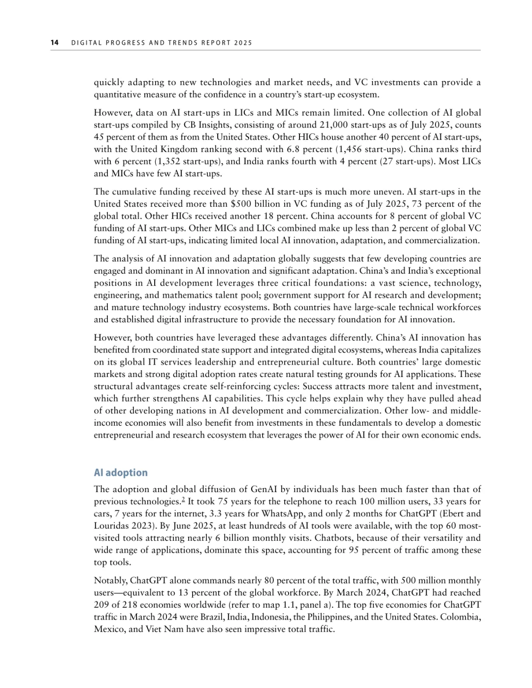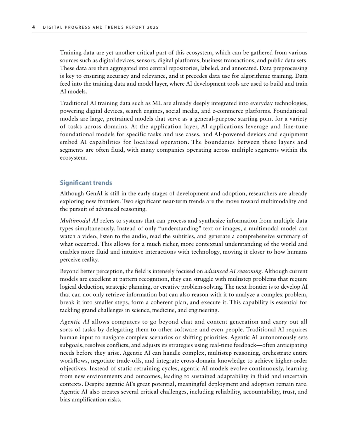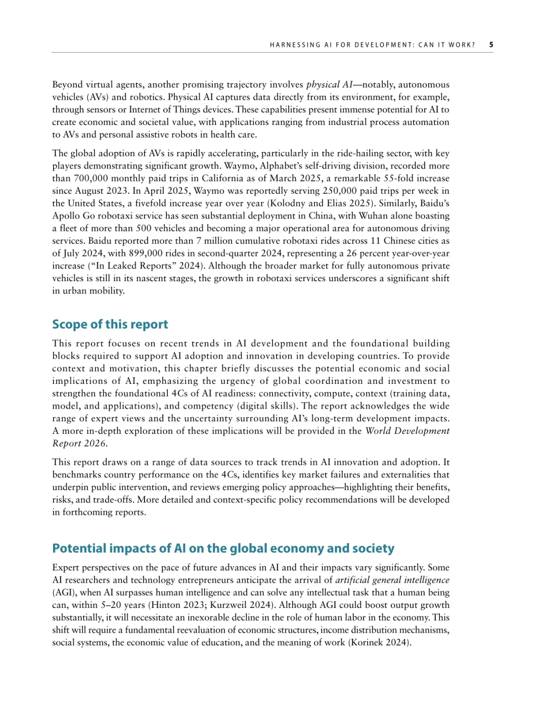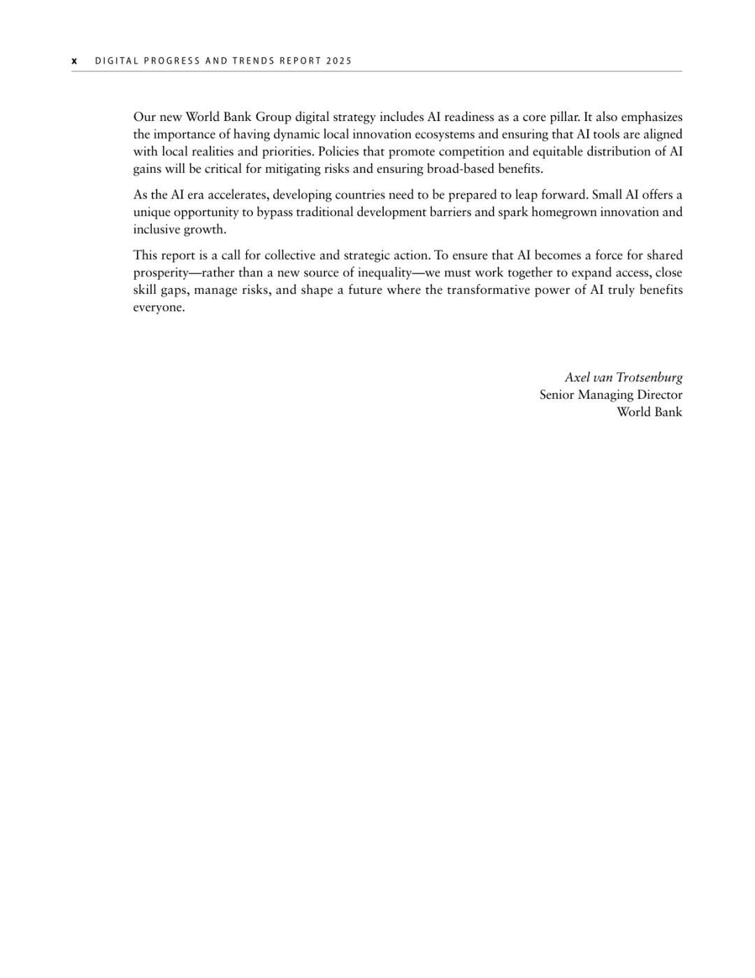 导读:报告聚焦人工智能发展基础建设,提出 “连接、算力、场景、能力” 四大核心支柱,为低收入和中等收入国家利用 AI 实现包容性增长提供战略指引。AI 技术正重塑全球经济与社会,但创新与应用存在显著全球差距。高收入国家主导 AI 模型研发与算力供给,占全球 87% 的云服务出口和 77% 的协同数据中心容量。低收入国家面临数字基础设施薄弱、数据资源匮乏、数字技能不足等多重障碍,基础数字技能普及率不足 5%,难以充分享受技术红利。报告强调,各国需根据自身 AI 就绪度精准投资四大支柱。低就绪度国家应优先完善网络与电力基础设施,提升设备可及性;中等就绪度国家需强化数字技能培训与本地化数据建设;高就绪度国家可聚焦前沿算力与自主模型研发。通过政策协同、跨境合作与风险管控,AI 有望成为缩小发展差距、推动可持续发展的关键力量。
