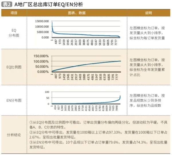 ①订单量(EQ)分析:单张订单出货数量的分析,提供对拣货设施、设备的选择。