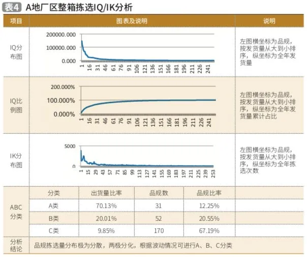 ③品规数量(IQ)分析:每单一品规出货总数量的分析,提供库存、存储设施、设备的选择。