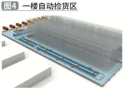 一楼整件拣选区:根据拣选策略需求,规划约150个拣选站台,约6台拆垛机器人全自动拣选;