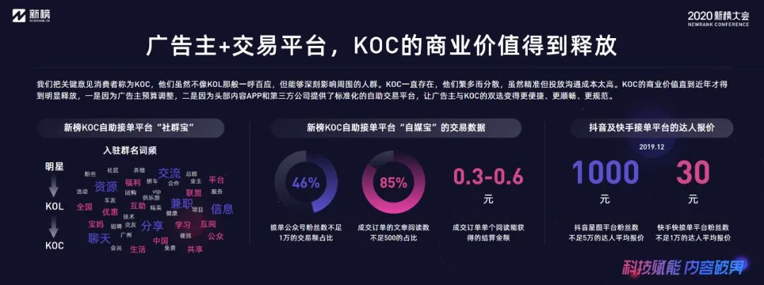 KOC,是能够影响周围人群的发声者。从新榜KOC自助接单平台“社群宝”的入驻群名词频能看出,在育儿、团购、车友、健康等领域中,一直隐藏着“身边的意见领袖”。随着新媒体的发展以及营销重心的转移,继明星、KOL之后,KOC逐渐从幕后走到台前,释放商业价值。头部内容APP和第三方公司提供了标准化的自助交易平台,让广告主与KOC的双选变得更便捷。