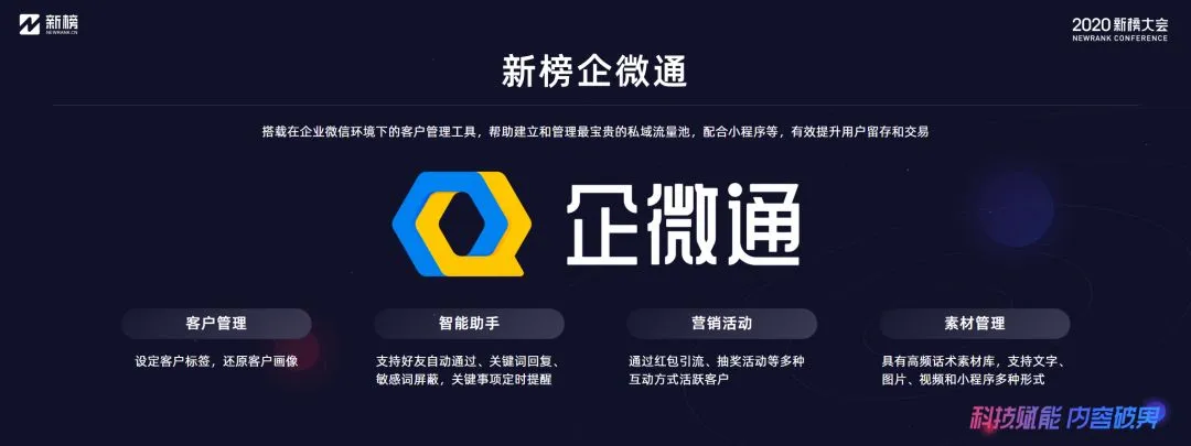新榜“企微通”,是搭载在企业微信环境下的客户管理工具,能够帮助企业建立和管理最宝贵的私域流量池,配合小程序等,有效提升用户留存和交易。