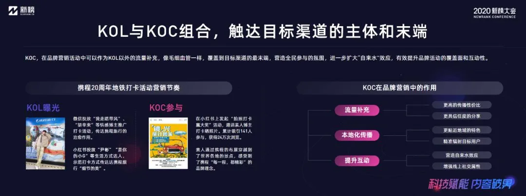 在品牌整合营销中,KOC也逐渐成为重要补充。携程去年20周年举办了很多活动,其中包含了在北京、上海两城市地铁举办的“镜兴旅行图鉴”活动,当时采用了KOL推广+KOC曝光的模式,引导小红书素人打卡,这种模式能够将品牌的理念触达到目标群体的最末端。
