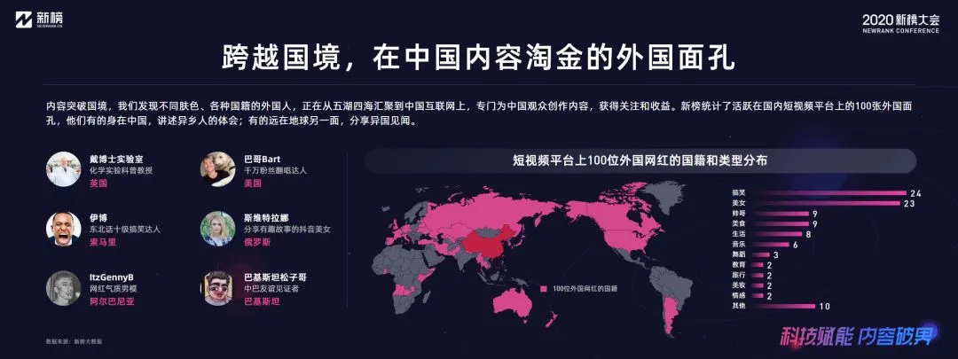 新榜分析了其中较为活跃的100张外国面孔,他们遍布世界各地,以搞笑和美女类目居多。