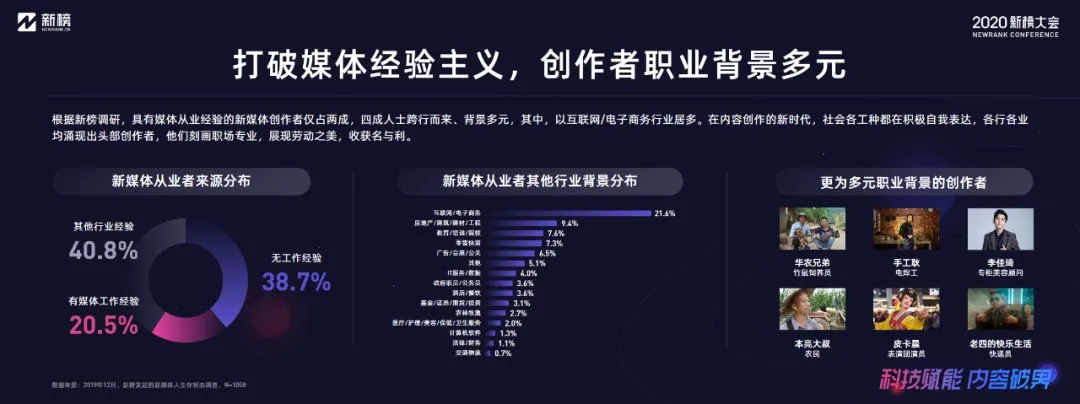 原先,“做内容的人”特指媒体工作者,而在今天,“内容人”的外延扩大。根据新榜调研,具有媒体从业经验的创作者仅占两成,四成人士跨行而来、背景多元。其中,以互联网/电子商务行业居多,也不乏基建、教育、零售行业的人涌入进来。