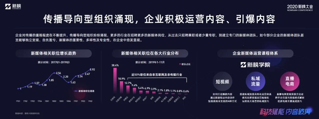 2020新年伊始,以“新媒体,找新榜”为使命的互联网内容科技公司新榜在京举办每年一度的新榜大会,并发布《2020年内容产业年度报告》。