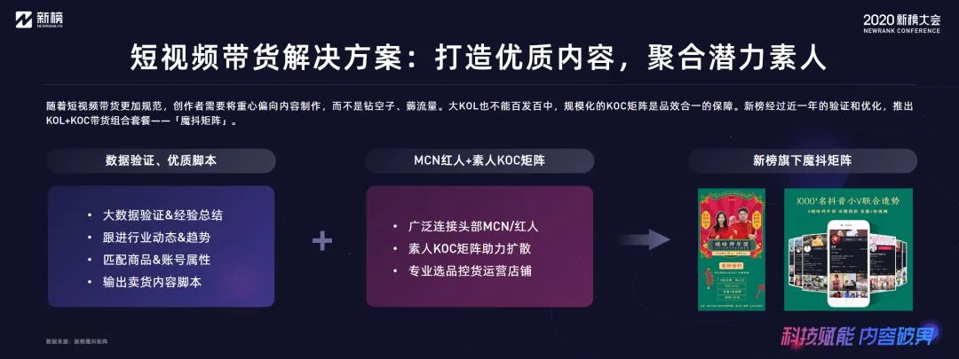 随着短视频带货更加规范,创作者需要将重心偏向内容制作,而不是钻空子、薅流量。短视频主要通过算法分发,粉丝并不是核心要素,大KOL也不能百发百中,规模化的KOC矩阵是品效合一的保障。新榜经过近一年的验证和优化,推出KOL+KOC带货组合套餐——「魔抖矩阵」,一方面对接顶流MCN达人和海量KOC,提供商品匹配和优质内容脚本,另一方面对接品牌货主,进行规模化的带货投放,品效合一。