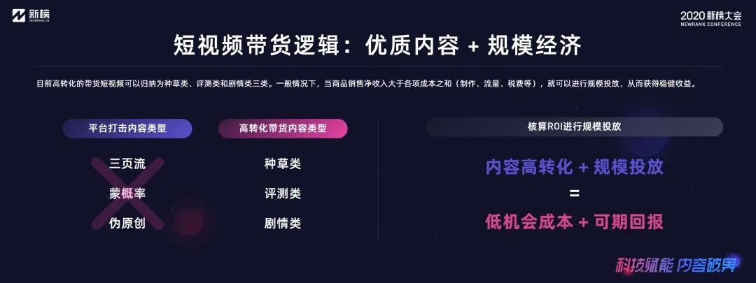 短视频带货的逻辑可以简单归纳为:优质内容+规模效应。好的产品要依托好的内容,目前高转化的带货短视频可以归纳为种草类、评测类和剧情类三类。同时,平台开始发力打击低质内容,三页流、蒙概率、伪原创等内容都是平台重点肃清对象。