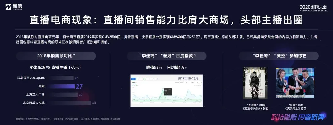 除了在淘宝生态内具有惊人的导购能力,以薇娅、李佳琦为代表的淘宝头部主播,已经具备突破全网的内容力和影响力,他们的百度指数保持在月均1万以上,并开始参加杂志、综艺等拍摄。主播的出圈也意味着直播电商这一购物形态正在被消费者广泛熟知和接纳。