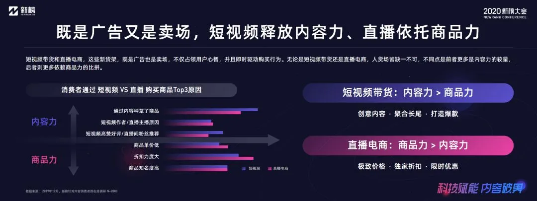 短视频带货和直播电商,这些新货架既是广告也是卖场,不仅占领用户心智,并且即时驱动购买行为。无论是短视频带货还是直播电商,人货场皆缺一不可,不同点是前者更多是内容力的较量,后者则更多依赖商品力的比拼。